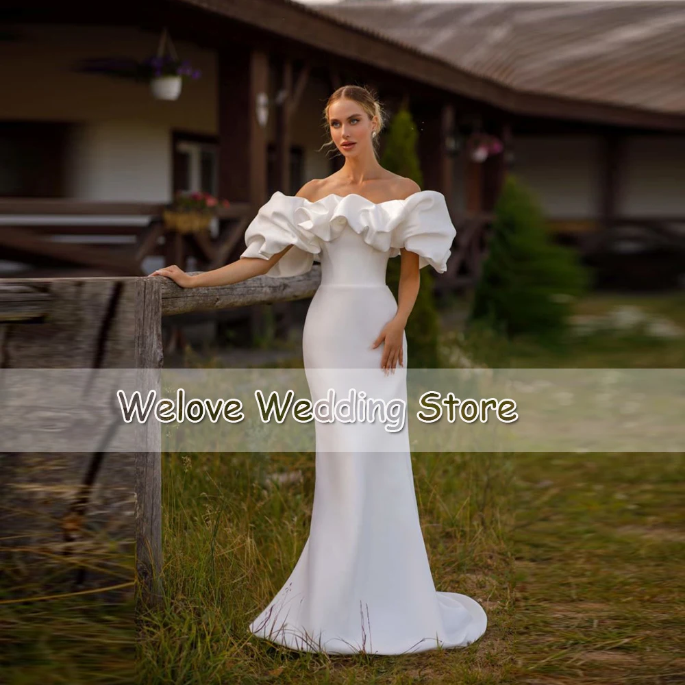 Elegant Satin Mermaid Wedding Dress Off Shoulder Ruffles Short Sleeve White Bridal Gown For Woman Modern Robe De Mariage Custom