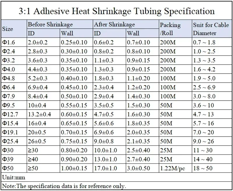 1/3/5/10/25M 3:1 Heat Shrink Tube dia 1.6/2.4/3.2/4.8/6.4/7.9/9.5/12.7/15.4/19.1/25.4/30/39/50mm With Glue Double Wall Tube