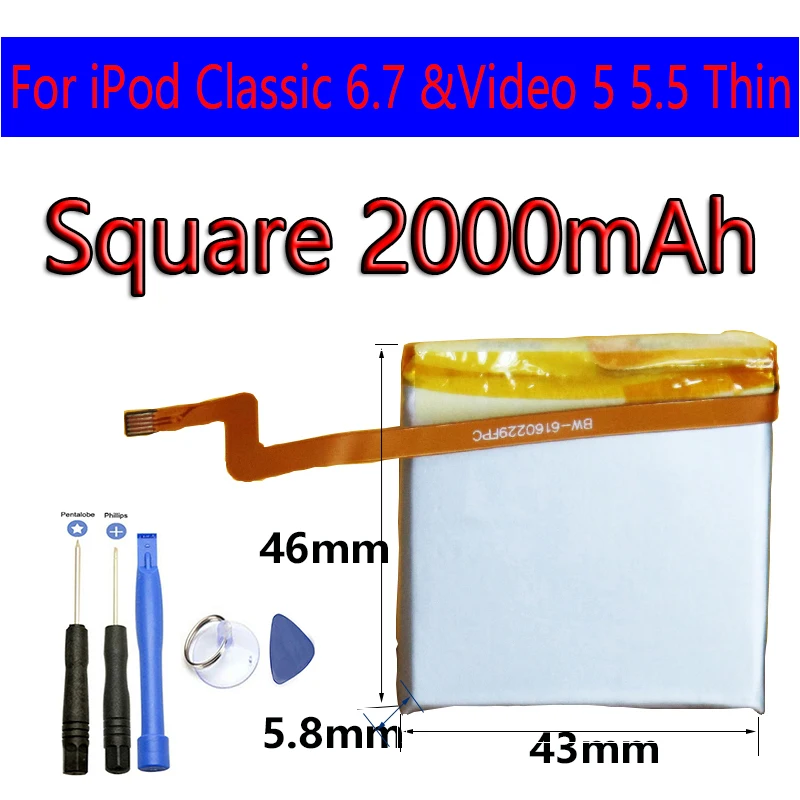 2000mAh Square Battery Upgrade SSD replacement for iPod Classic 6.7&Video 5 5.5 Thin