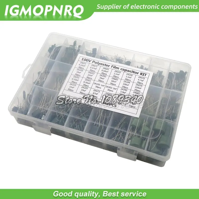 660PCS/lot 24Value Capacitor kit 100V 2A221J to 2A474J Polyester Film Capacitor Assorted Kit 0.47nF 0.68nF 1nF 2.2nF Capacitors