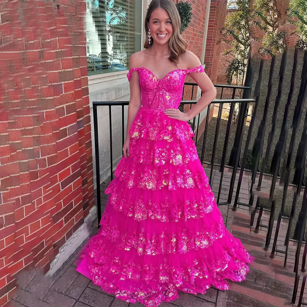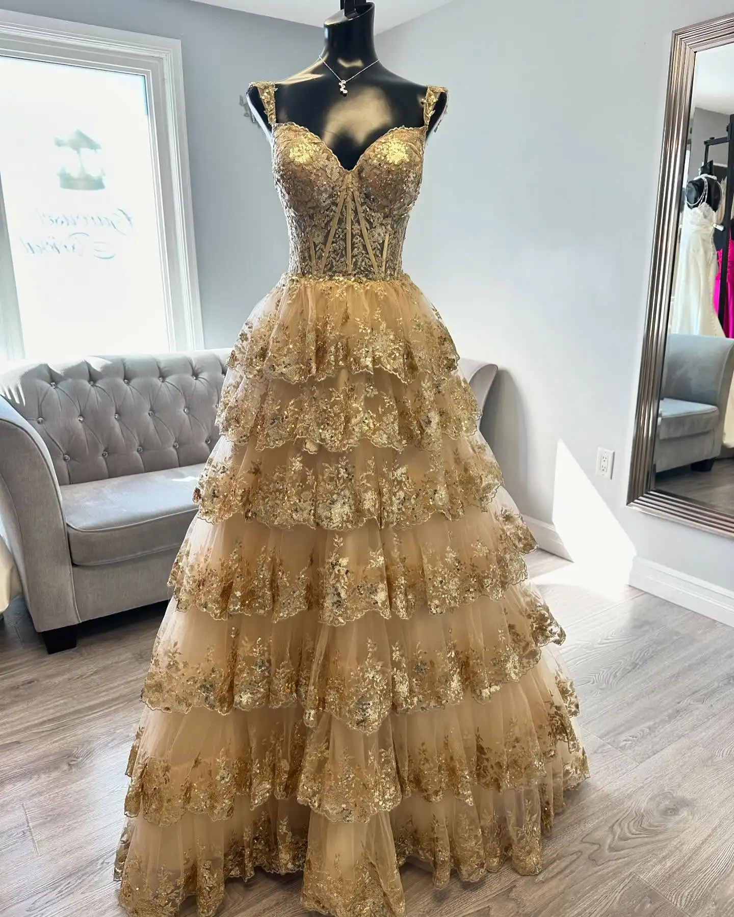 RFYR Puffy Gold Evening Dress Off Shoulder Vestidos De Noche Sweetheart Layered Prom Dress Appliques Party Dress Customized