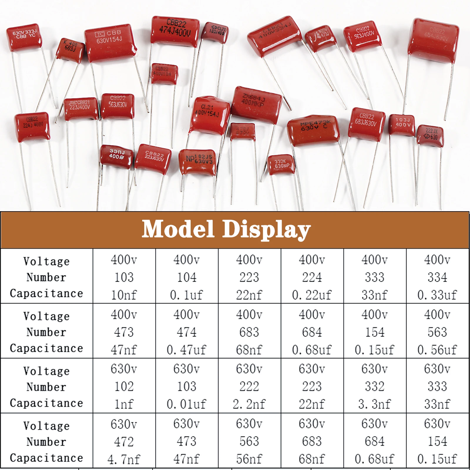20pcs CBB Capacitors Metallized Polypropylene Film Capacitor 0.01uf 0.22uf 0.33uf 0.47uf 0.68uf 1nf 10nf 22nf 23nf 47nf 68nf
