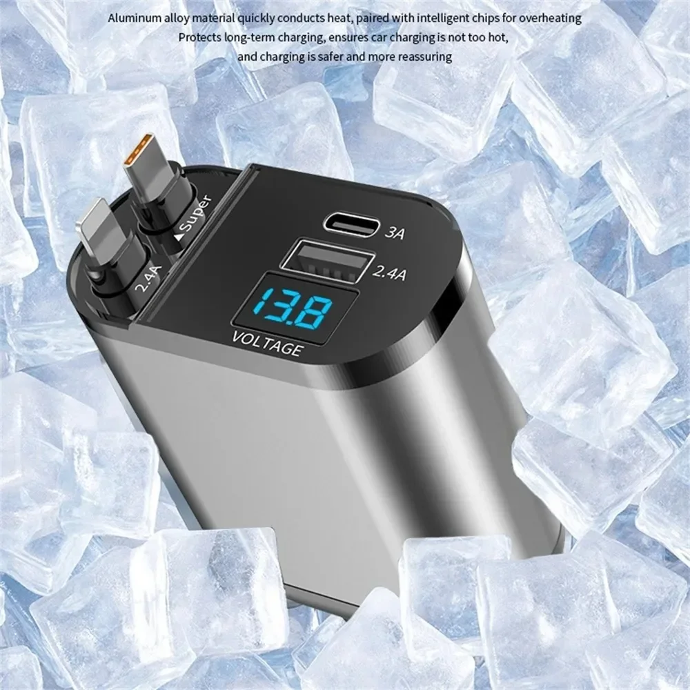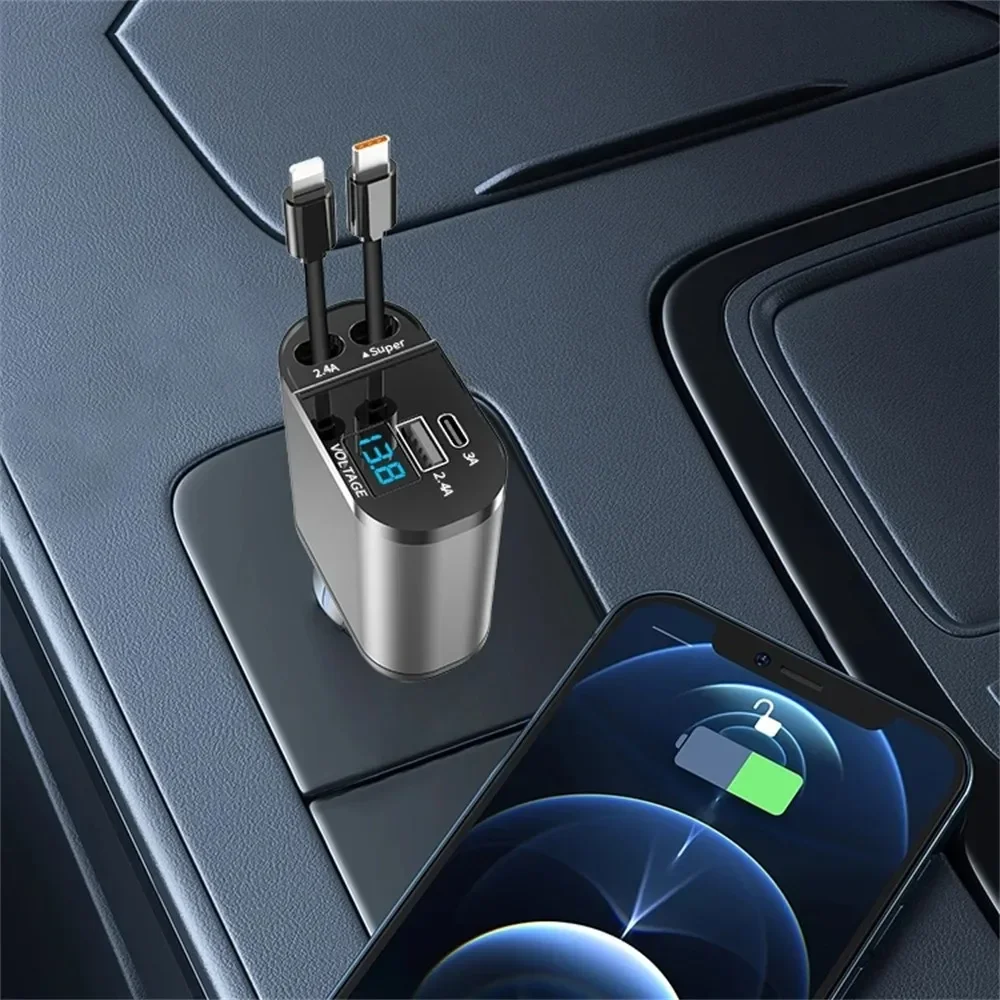 4 in 1 120W Car Charger Retractable Car Cigarette Lighter Adapter USB Type C Fast Charger Cable For IPhone Xiaomi Huawei Samsung