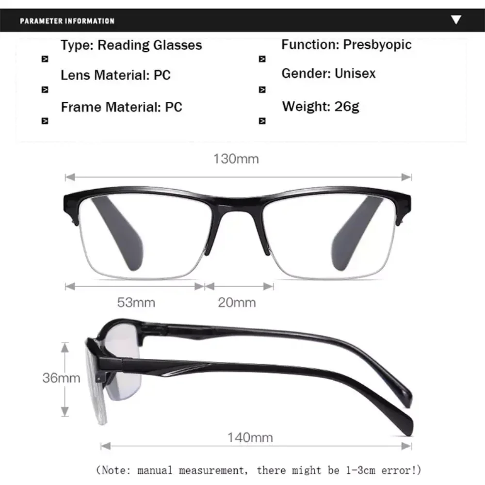 Square Reading Glasses Ultralight Half Frame Presbyopic Eyeglasses Men Women +0.25 0.5 0.75 1 1.25 1.5 1.75 2 2.25 2.5 2.75 3.0