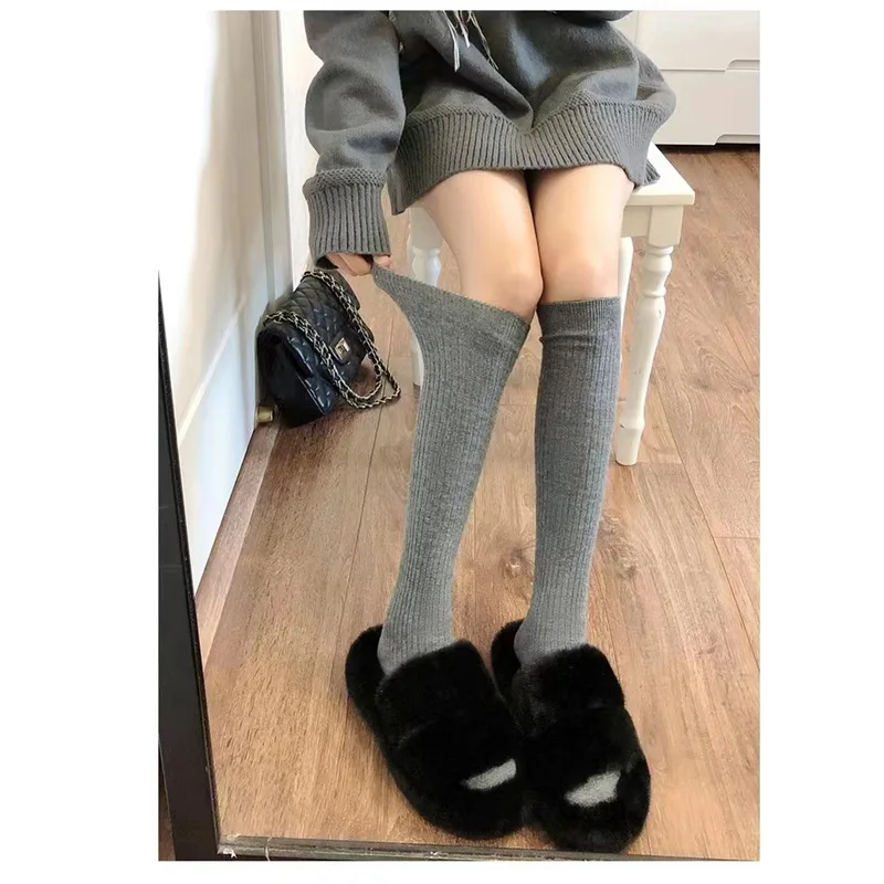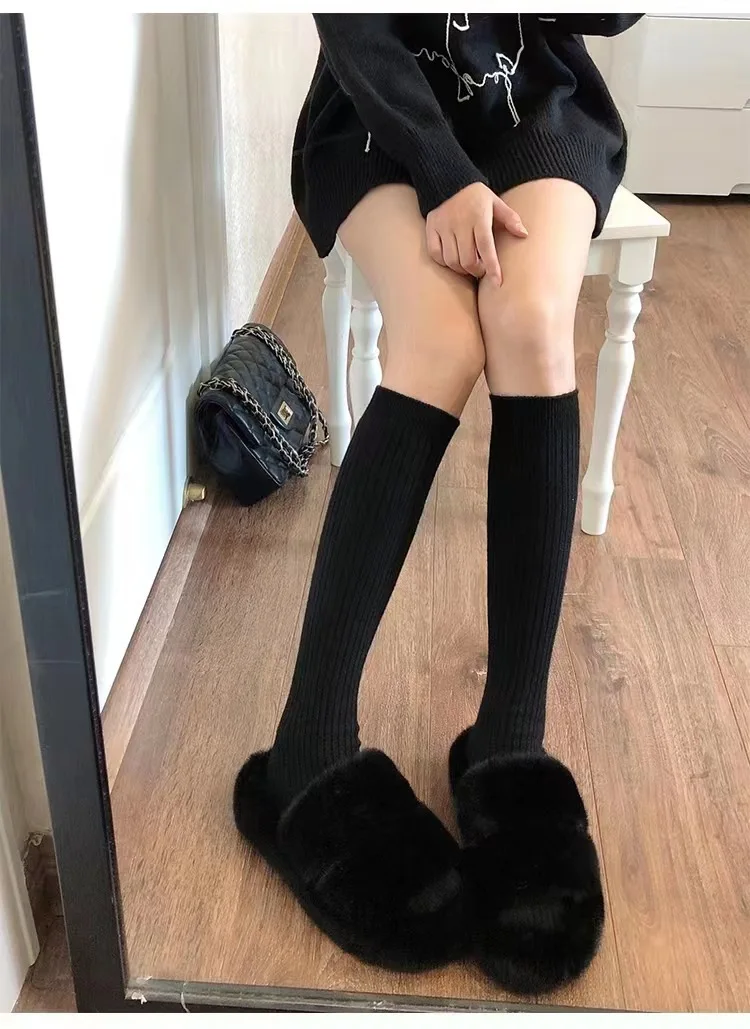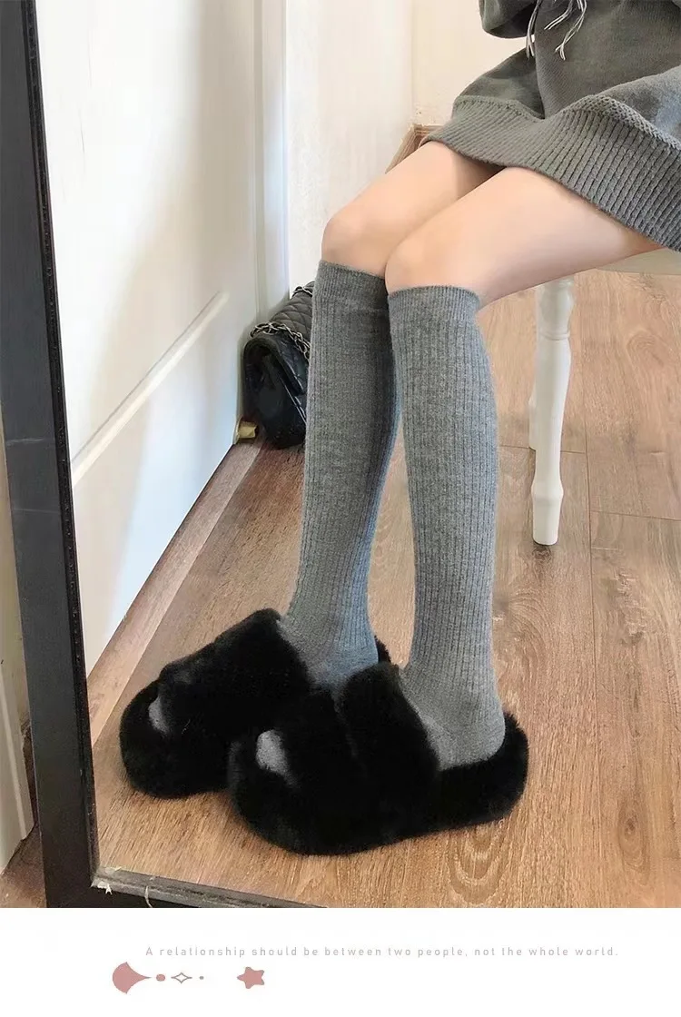 Autumn And Winter Women's Knitted Socks Solid Color Vertical Bar Warm Knee Length Socks Harajuku Fashion Lolita Socks