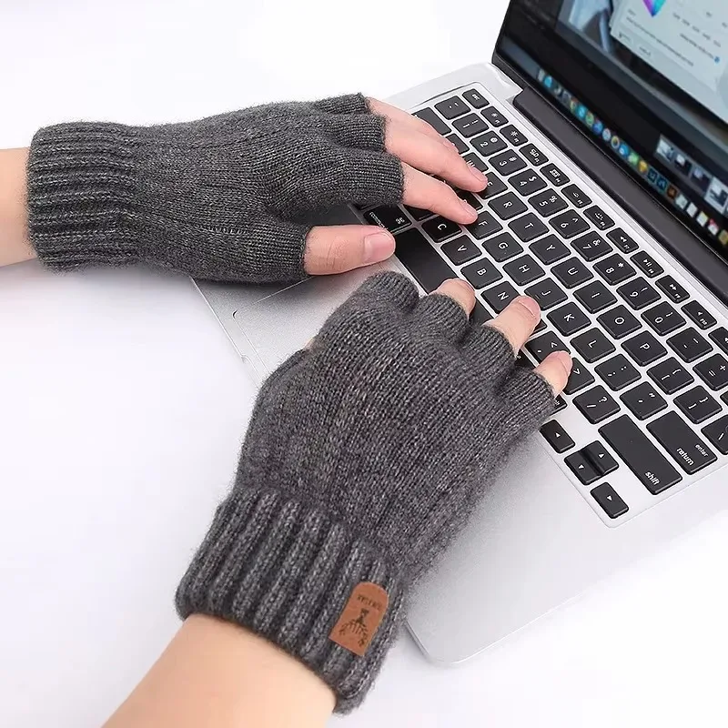 Winter Gloves For Men Half Finger Writting Office Cycling Knitted Gloves Students Alpaca Wool Warm Thick Elastic Driving Gloves