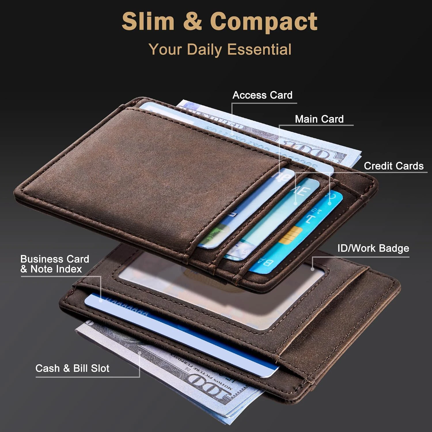 Genuine Leather RFID Blocking Retro Thin Card Holder wallet, Crazy Horse Leather Minimalist Slim Front Pocket wallets