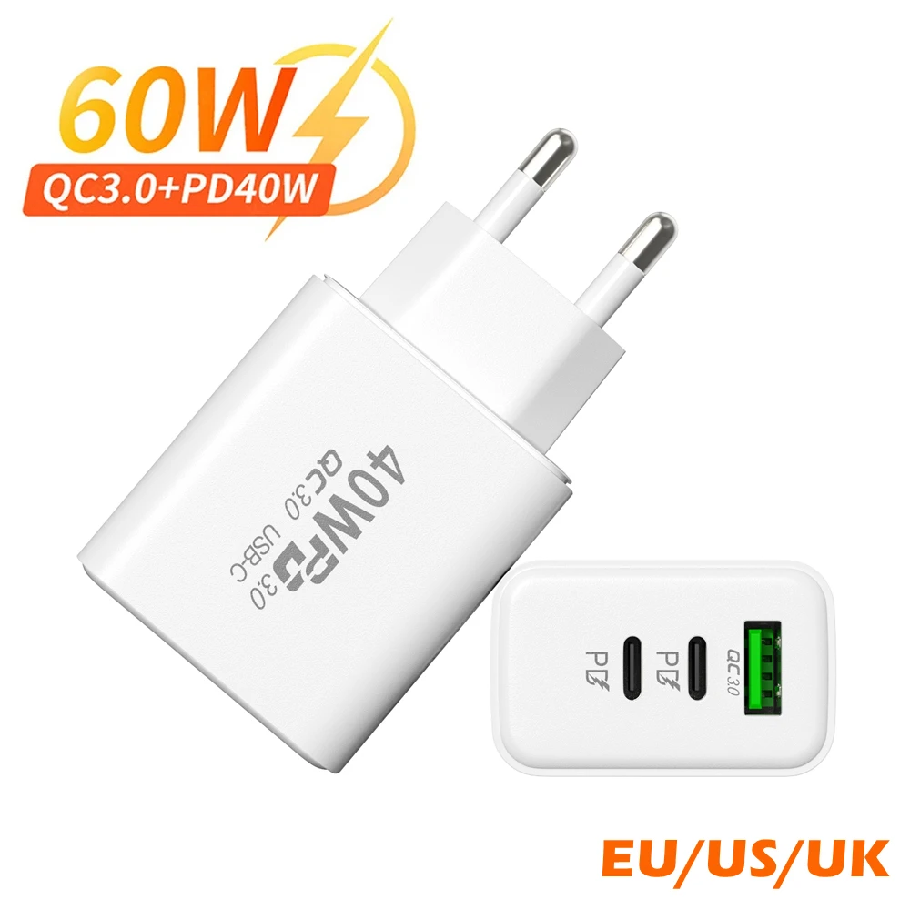 PD 60W Fast USB Charge Charger 3Ports EU/US Plug Wall Charger Adapter For iPhone 14 13 Xiaomi Huawei Samsung USB C Phone Charger