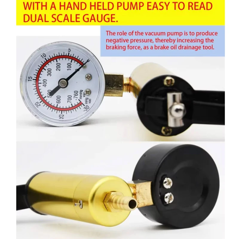 Vacuum pistol pump test kit, portable durable aluminum vacuum gauge manual vacuum pressure pump brake fluid discharge kit