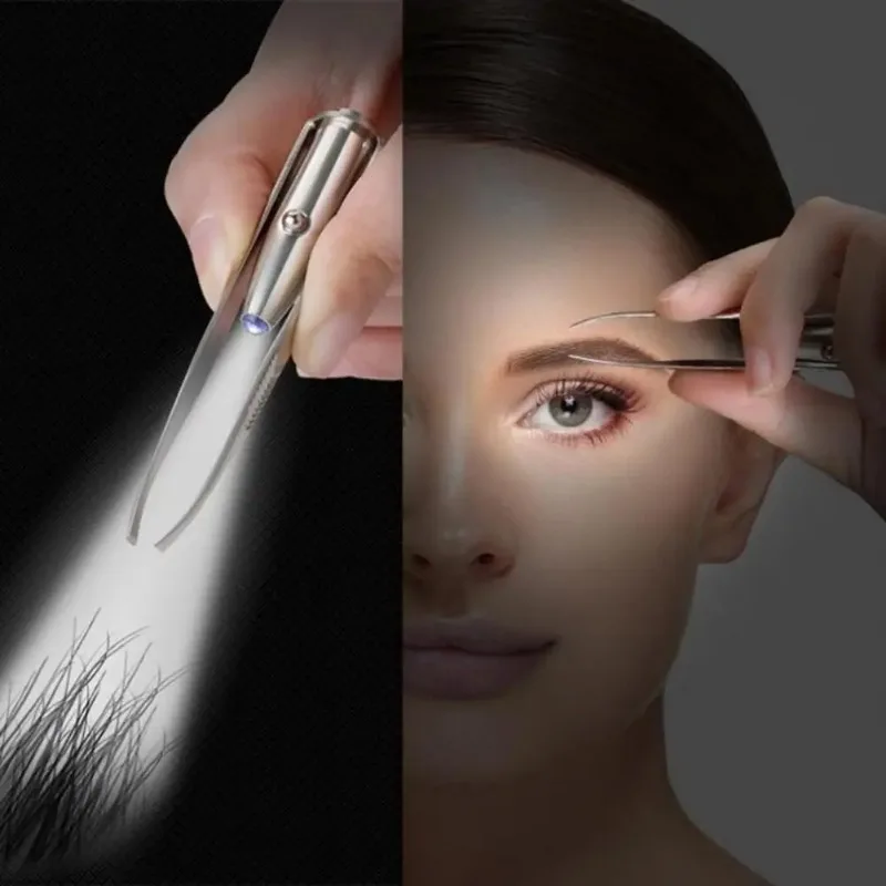 Stainless Steel Eyebrow Clip with LED Light Professional Lighted Eyebrow Tweezers Eyelash Brow Hair Removal Clamp Makeup Tools