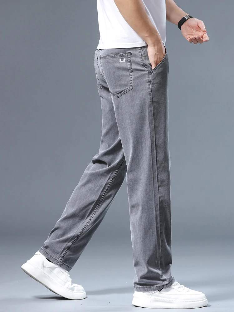 Summer Thin Men's Loose Straight Jeans Lyocell Soft Drape Business Casual Trousers Classic Smoke Gray Brand Ice Silk Pants