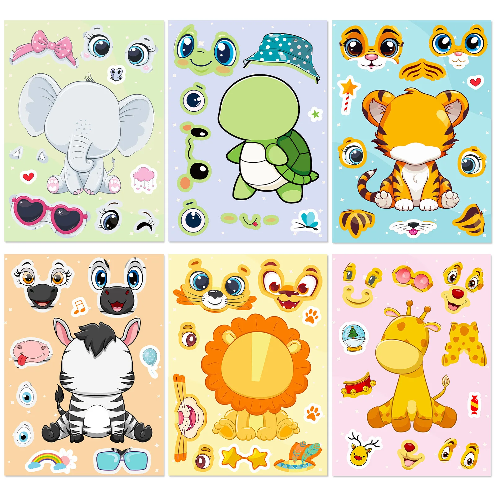 6Sheets Cute Cartonn DIY Puzzle Sticker Games Animals Make A Face Funny Assemble Stickers Decor