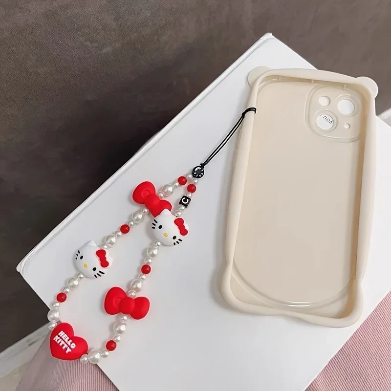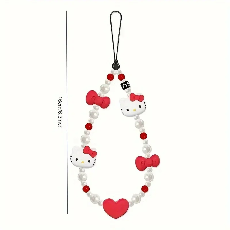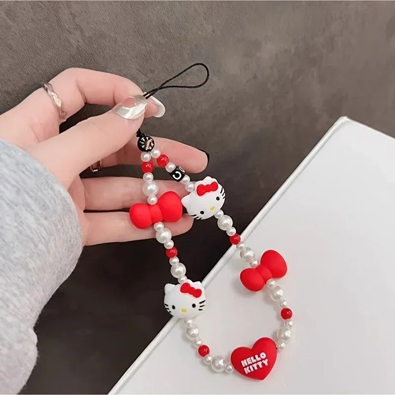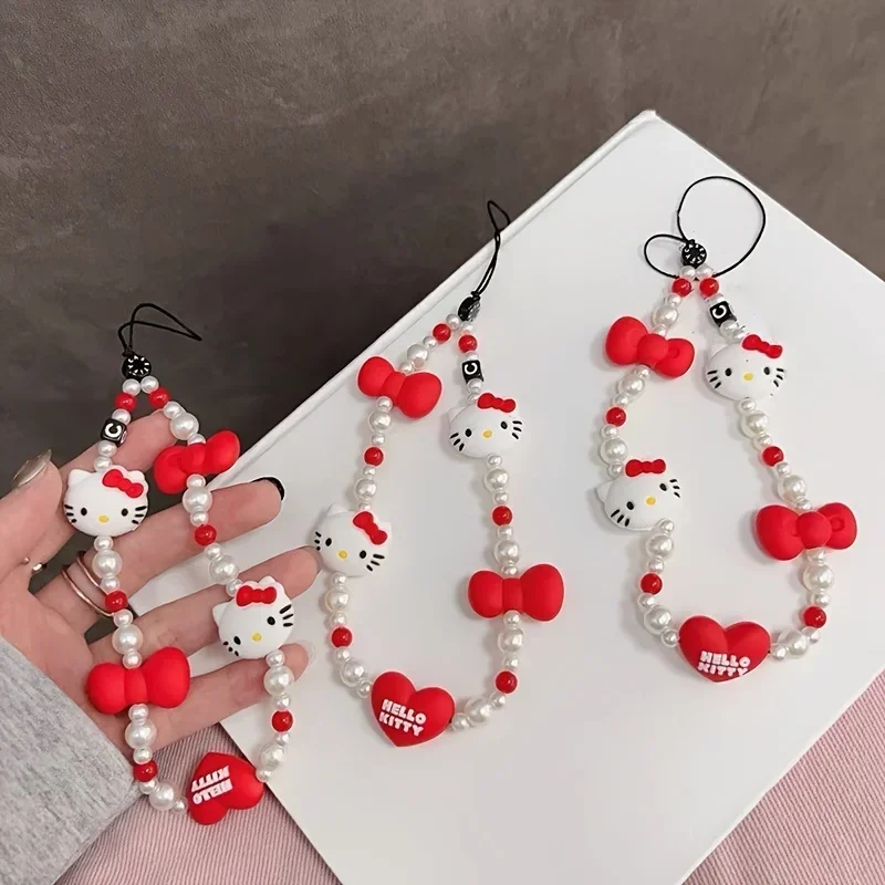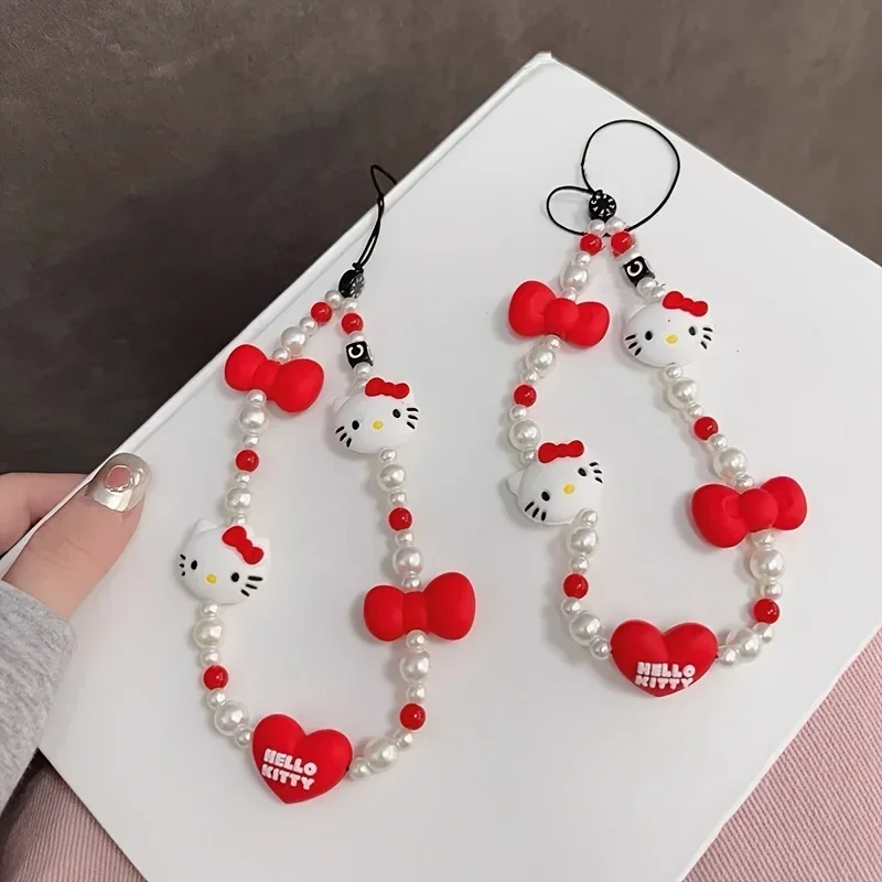 Sanrio New Mobile Phone Hanging Chain Hello Kitty Love Bow Mobile Phone Chain Beaded Chain Jewelry Lanyard Women's Kawaii Gift