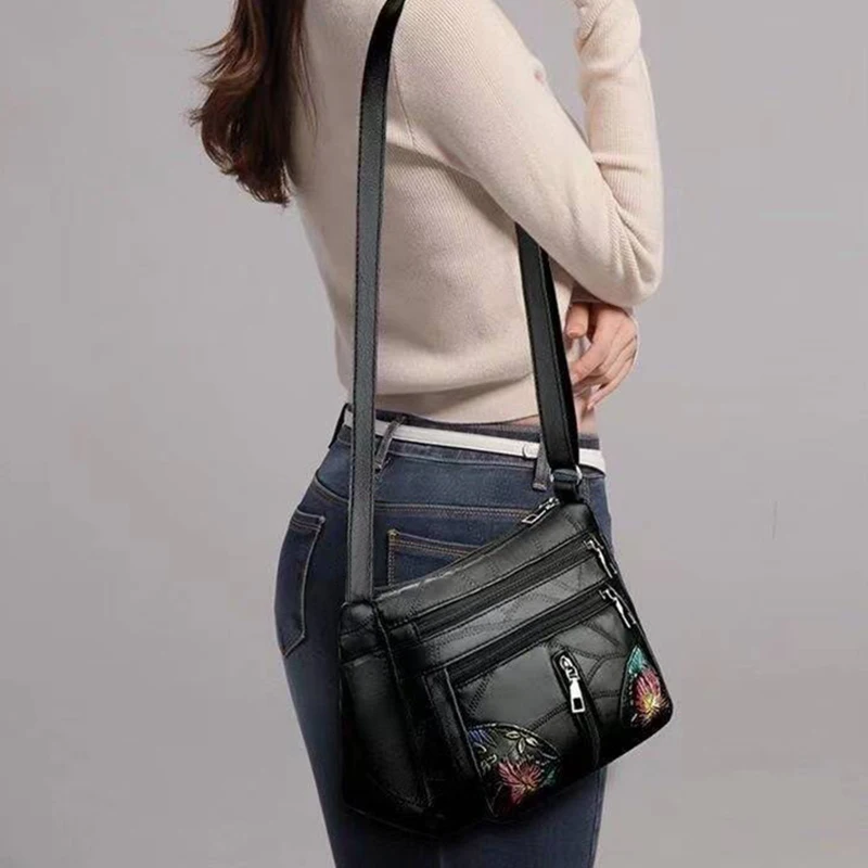 Women's Floral Embroidery Shoulder Bag Multi-zipper Casual Crossbody Bag Lightweight for Daily Shopping Dating Outing