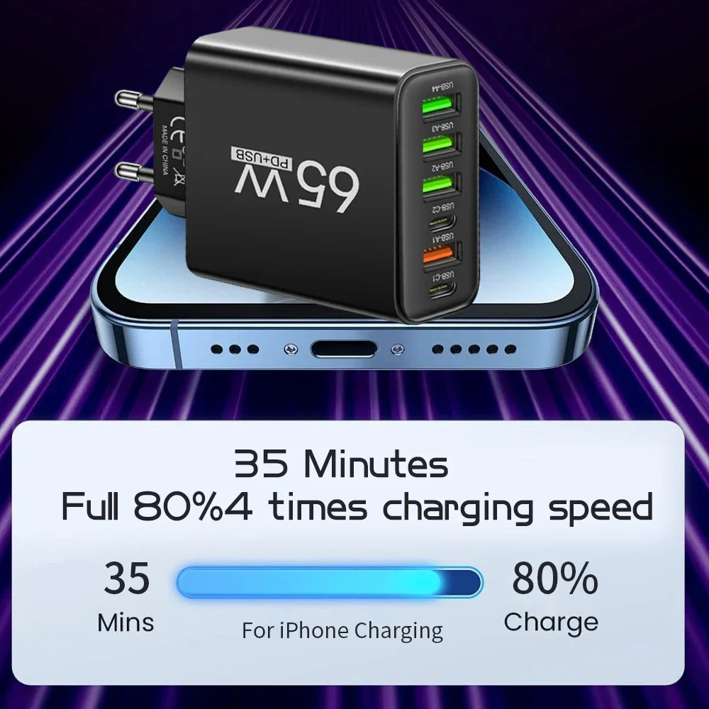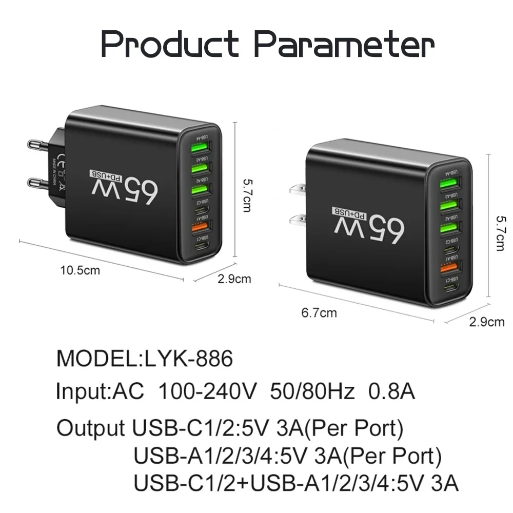 65W USB C Charger PD Fast Charging Mobile Cell Phone Type C Multiple 6 Ports Wall Adapter for iPhone 15 16 Xiaomi Huawei Samsung