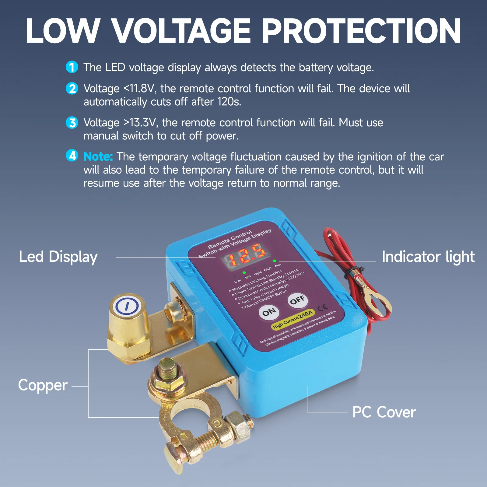 Car Kill Switch Anti-Theft Remote Battery Disconnect Switch 12v 240A with Smart Voltage for Car Truck RV For Car Truck RV 1 Set