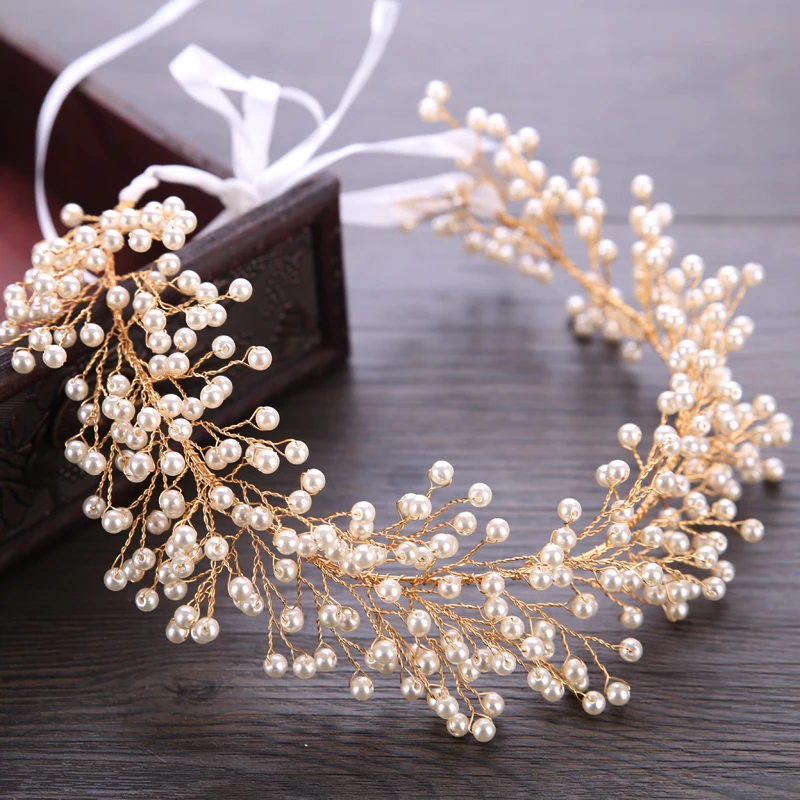 AiliBride Luxury Bridal Headband Tiara Pearl Wedding Headpiece Hair ornaments Tiara Gold Handmade Women Hair Jewelry