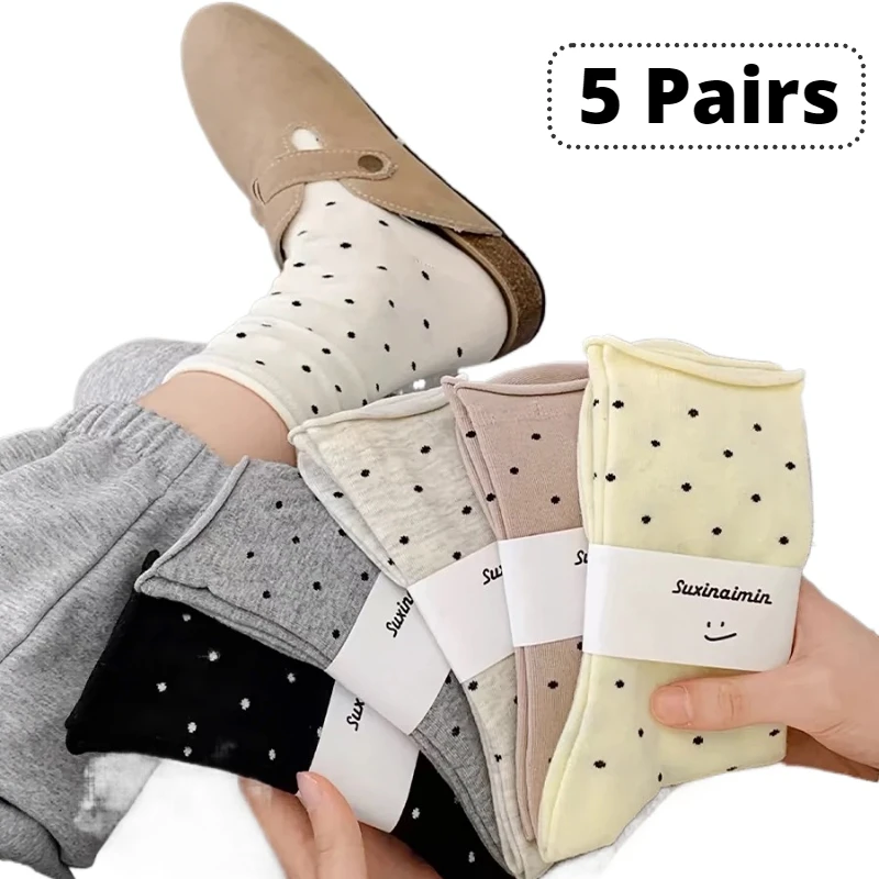 5 Pairs Polka Dot Socks, Cute College Style Rolled Edge Mid Tube Socks, Women's Stockings & Hosiery