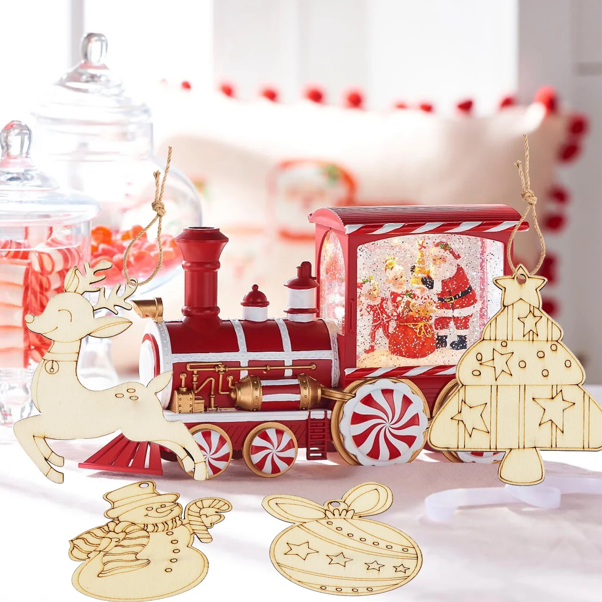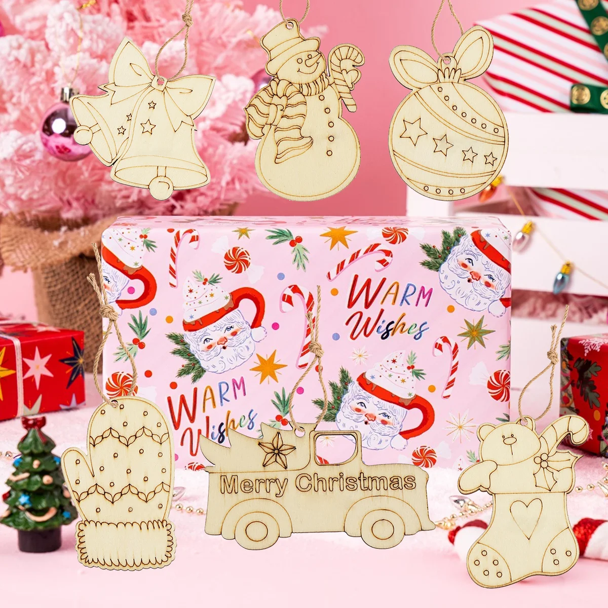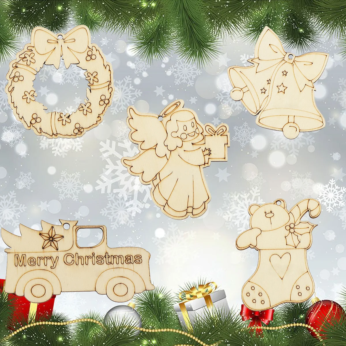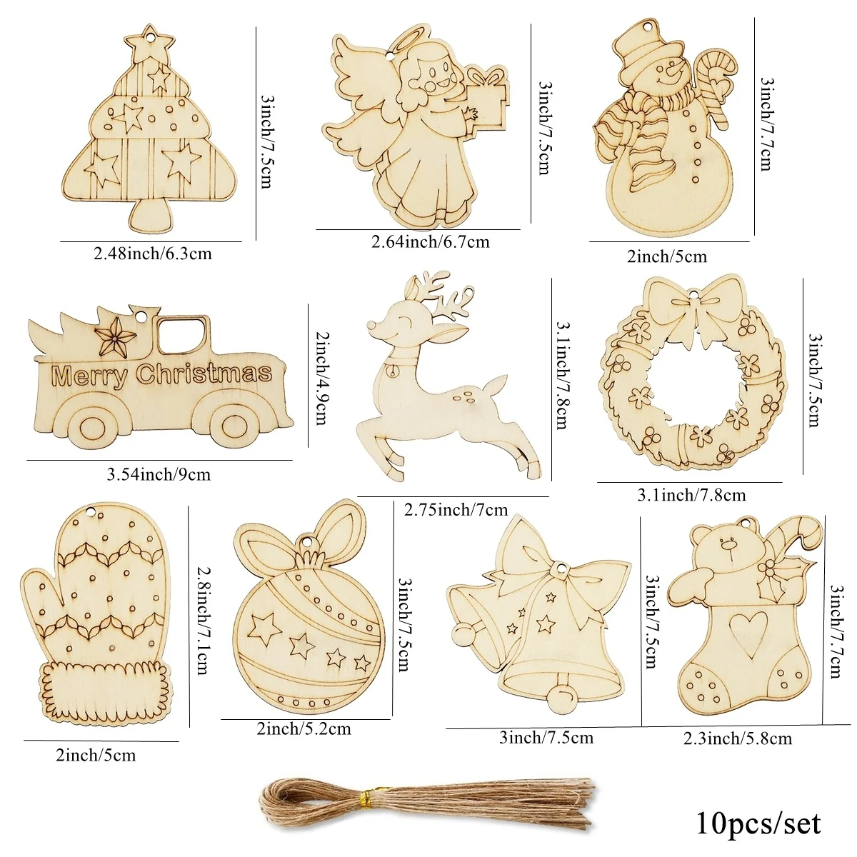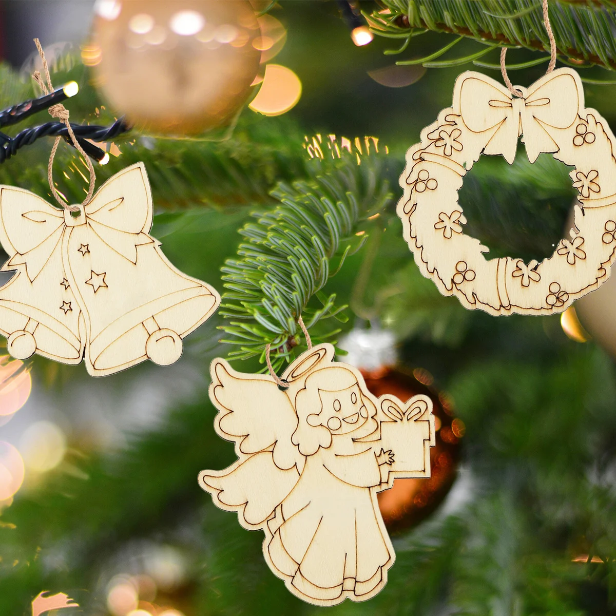 10Pcs Christmas Wooden DIY Painting Ornaments Angel Deer Wreath Pendant for Xmas Tree Hanging Decorations Kids Gifts Supplies