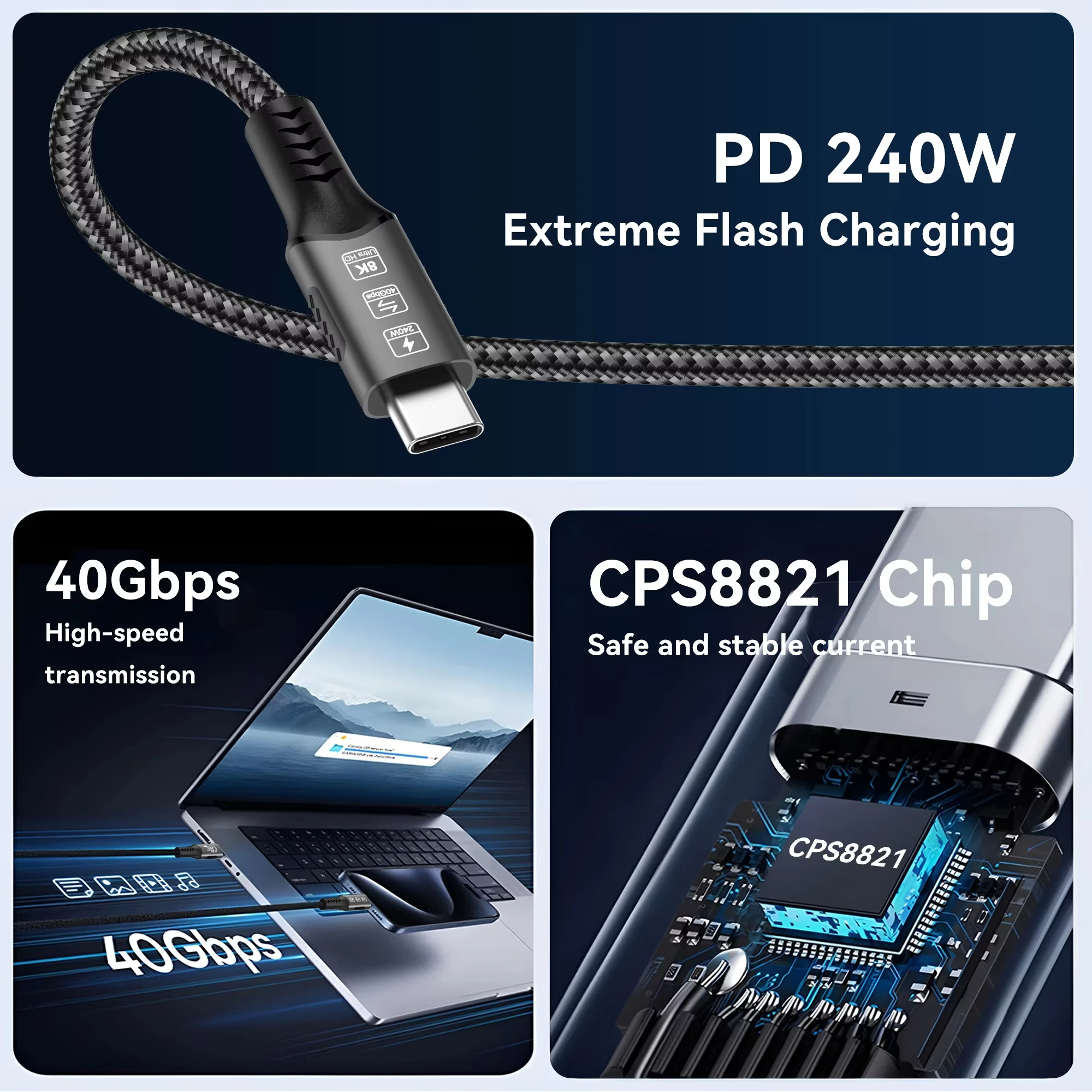 USB4 Cable Thunderbolt 3/4 40Gbps USB-C 8K Video Cable PD240W Fast Charger Suitable for iPhone 16 Macbook Hard Disk Data Cable