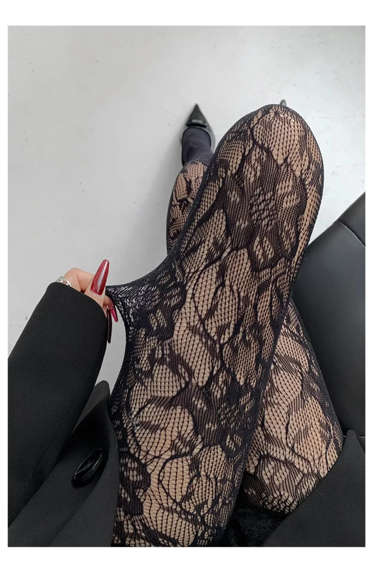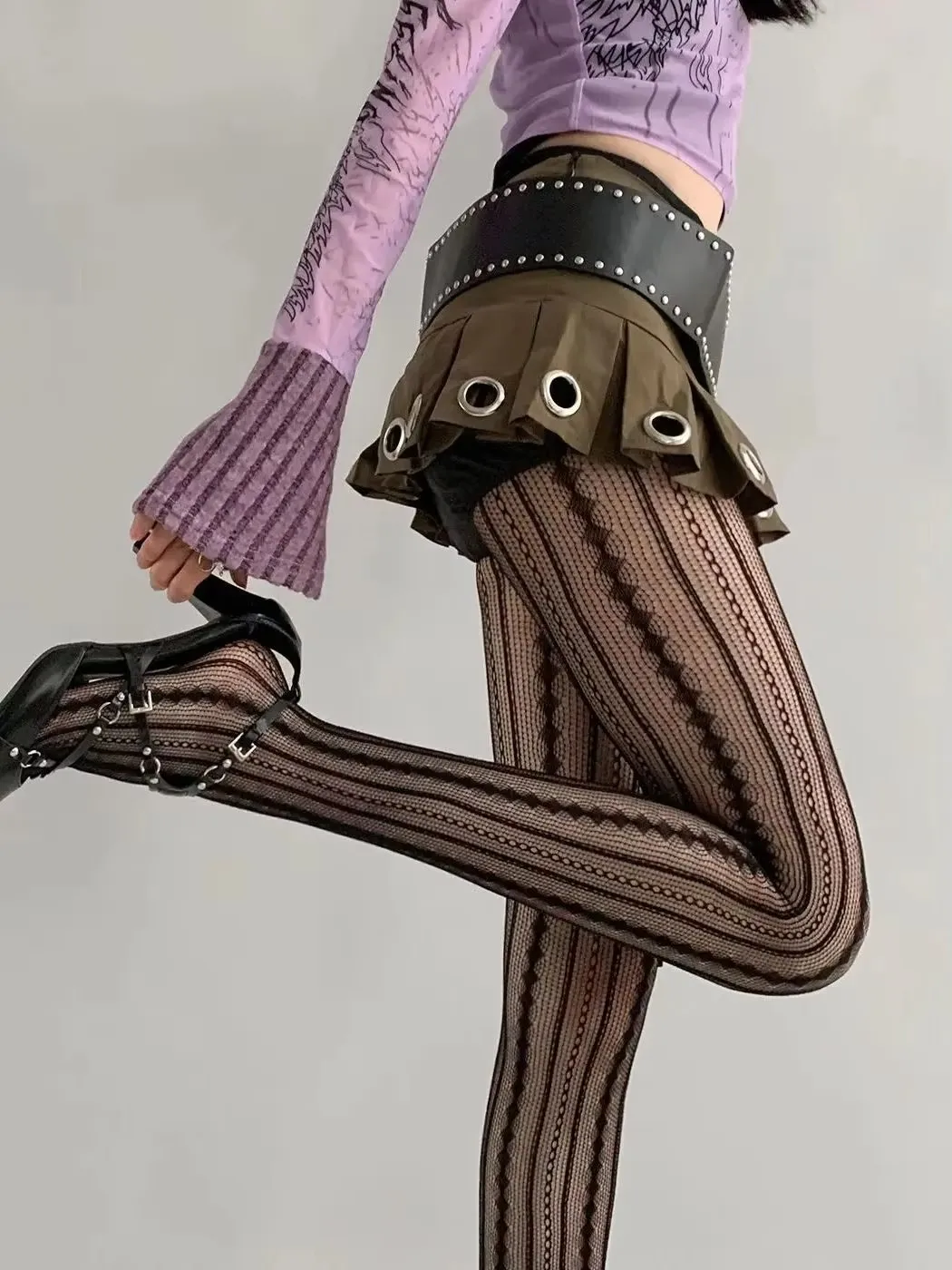 Hollowed Out Lace Tights Geometric Striped Patterned Fishnet Pantyhose for Women