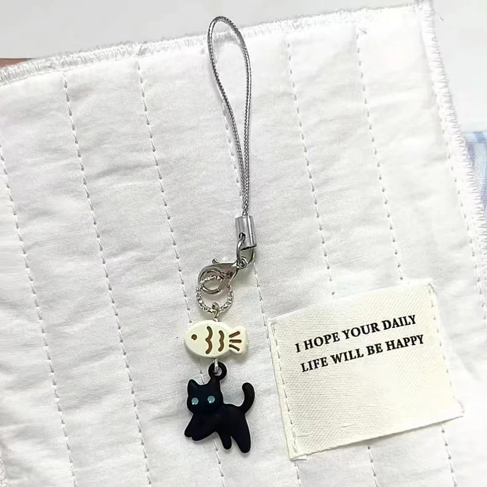 Cute Black Cat Keychain Cartoon Mobile Phone Chain Camera Earphones Pendant Bag Decorative Chain Kawaii Keyring Y2K Accessories