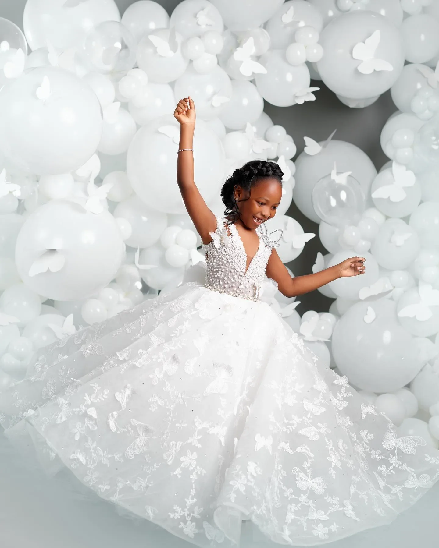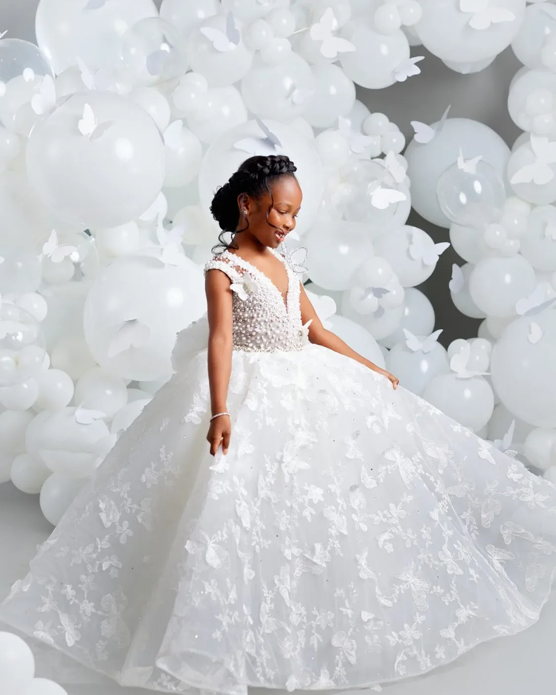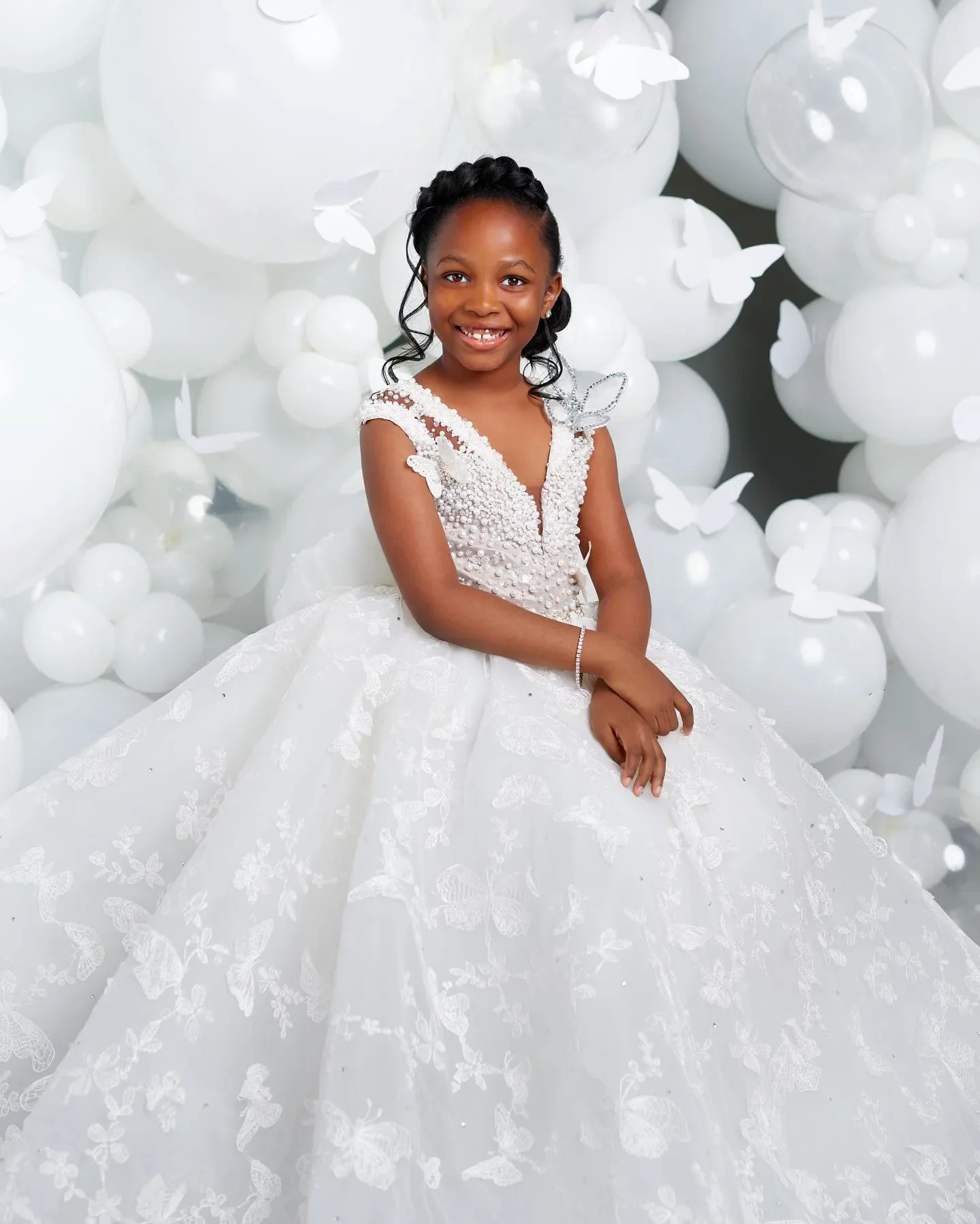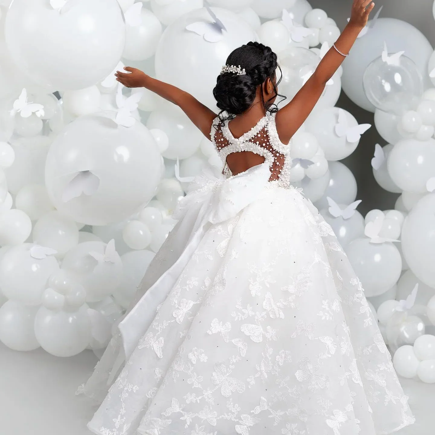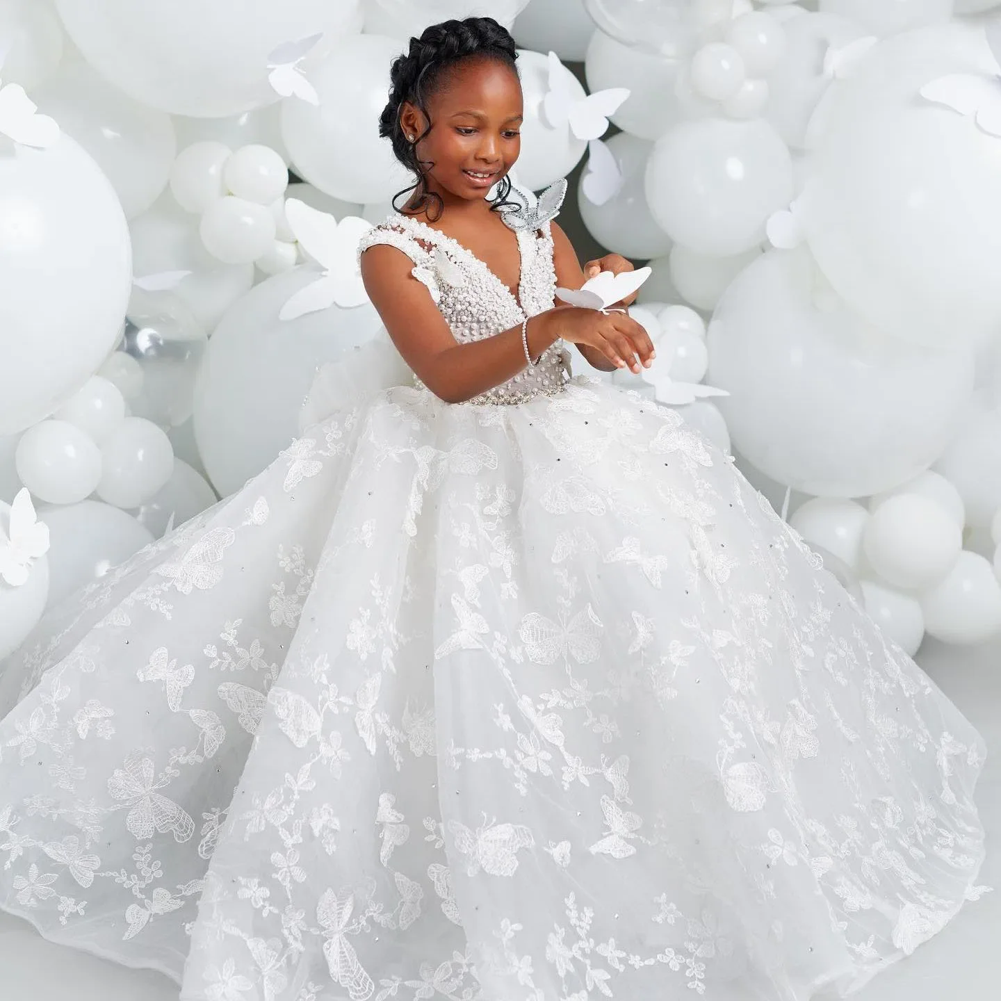 White Flower Girl Dresses for Wedding Butterfly Appliques Pearl Floor Length Girl Kids Birthday Party First Holy Communion Gown