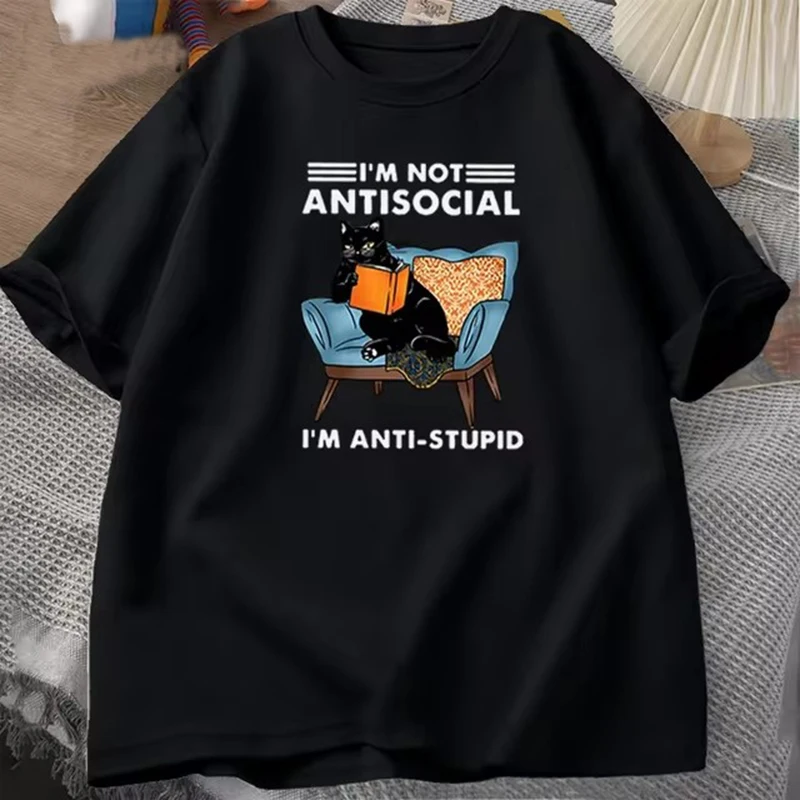 funny cat reading book T-Shirts Graphic Tees Cotton Mens Clothing O Neck Meme Short Sleeve Tees Harajuku Fashion Womens Oversize