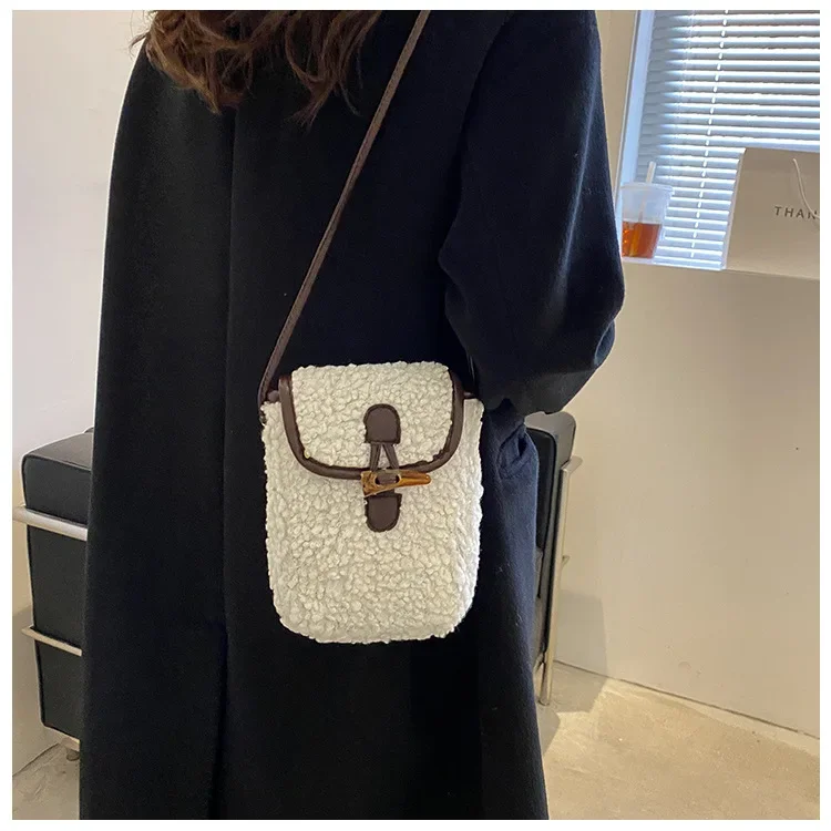 Lambswool Phone-bag Women Faux Fur Bags Tender Sweet Lovely Cross Body Teenagers Female Portable Horn Button Plush Square Cozy