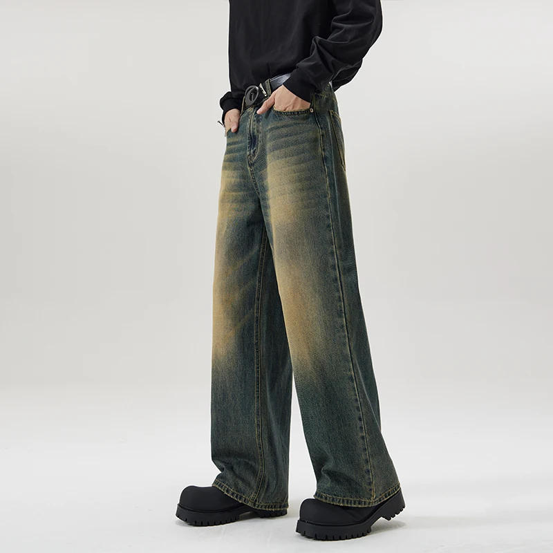 Vintage Distressed Men's Baggy Straight Jeans Spring Autumn Korean High Street Moustache Effect Denim Pants Streetwear Trousers