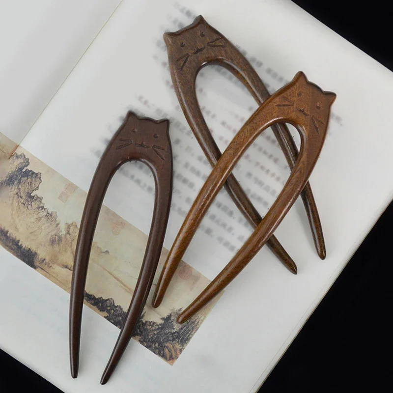 Chinese Cat Pattern Hair Sticks Wooden U Shaped Hair Forks for Women Girls Hanfu Hairpin Headwear Headpieces Hair Accessories