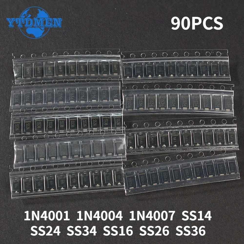 90pcs SMD Diode Kit 1N4007 1N4001 1N4004 SS14 SS16 SS24 SS26 SS34 SS36 9 Values X10pcs Rectifier Diodes Schottky