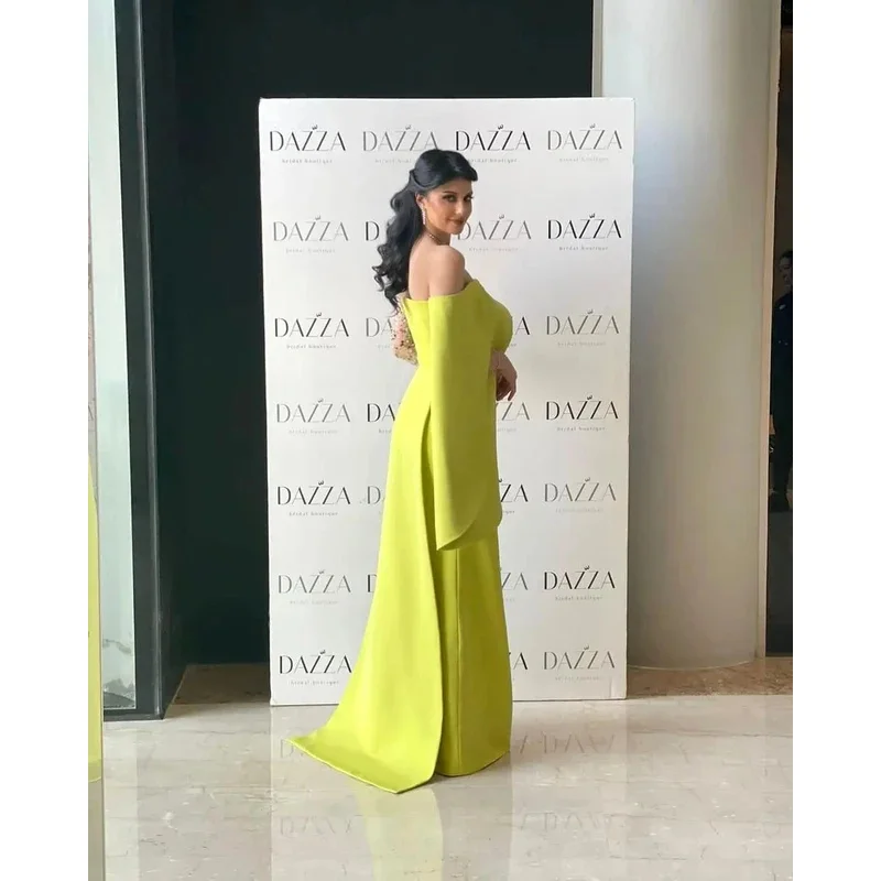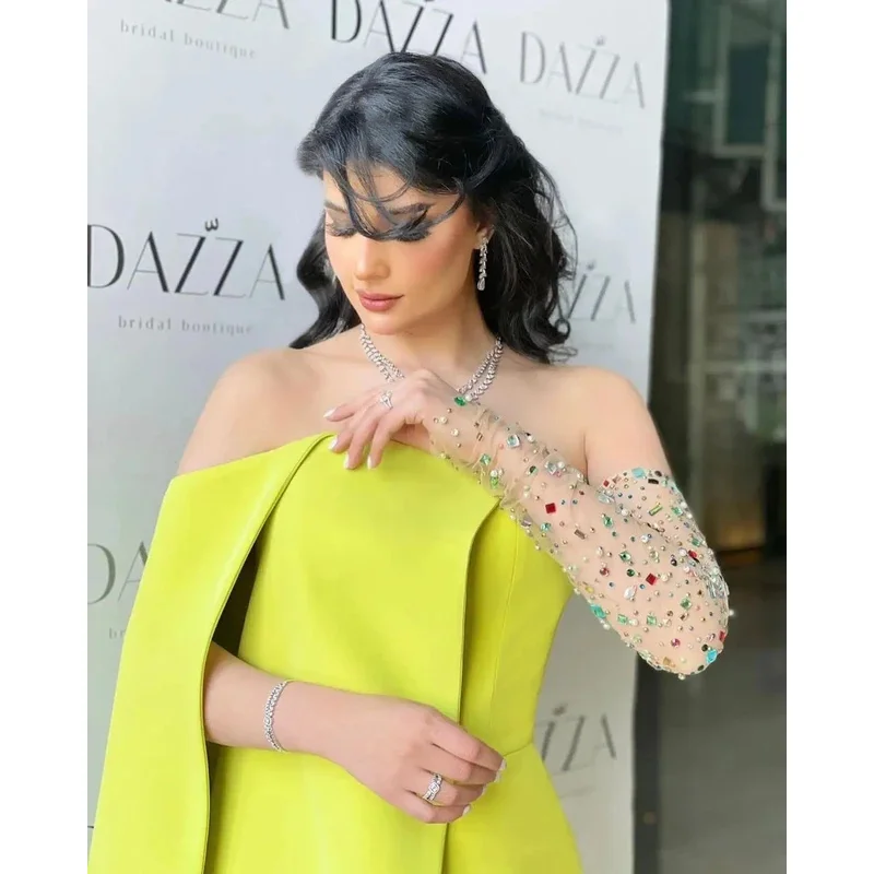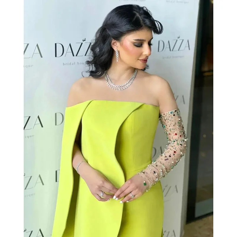 Indie Yellow Green Modern Boat Neck Strapless Evening Dress Floor Length Satin Crystal Saudi Arabia Prom Dresses Customized 2025