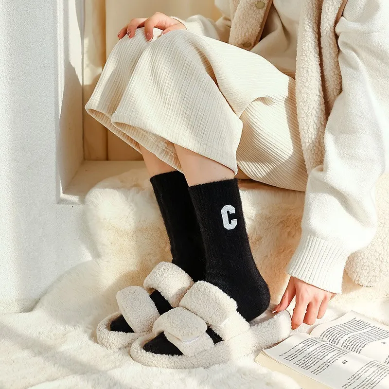 Women's Autumn Winter Socks Mid Tube Socks Cashmere Sock Embroidered Letter Pile Sock Thickened Warm Wool Sock Solid Color Socks