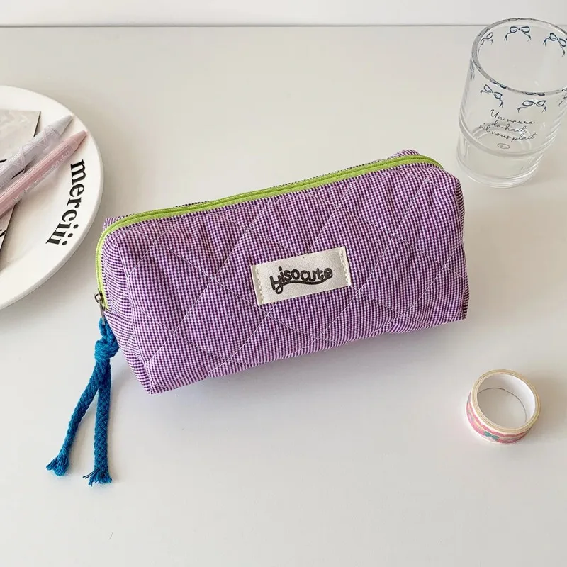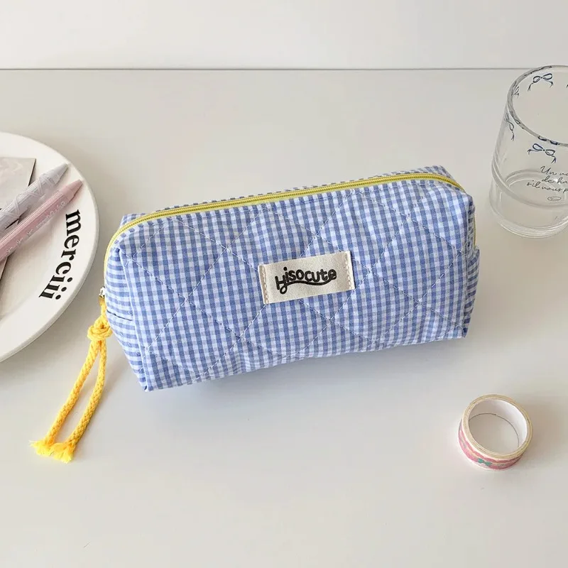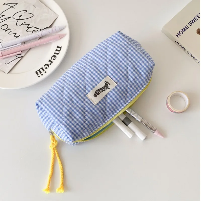 1PC Color blocking checkered pencil case, girls' stationery storage bag, large capacity cosmetics and miscellaneous storage bag