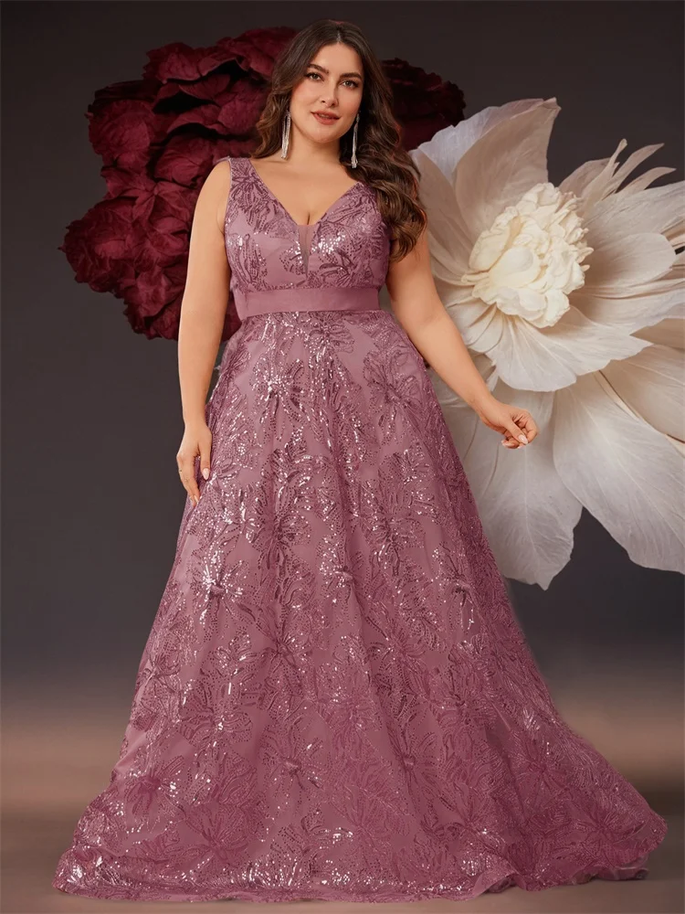 Plus Size Luxury Deep V-Neck Sequins Blue Evening Dress Women Elegant V-back Wedding Party Long Prom Cocktail Dresses