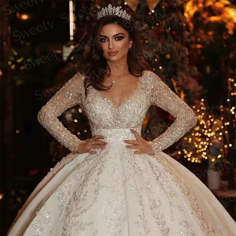 Shiny Chic Wedding Dress Fully Beaded With Princess Ball Gown O-Neck Full Sleeve Bride Dress Customized Button Vestido De Novia