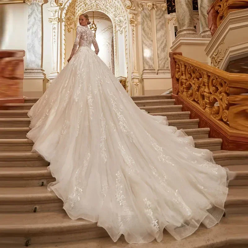 customized Luxury Long Sleeve Muslim Wedding dress Applique Lace High Neck Romantic Bridal Dress Robe De Mariee 2025
