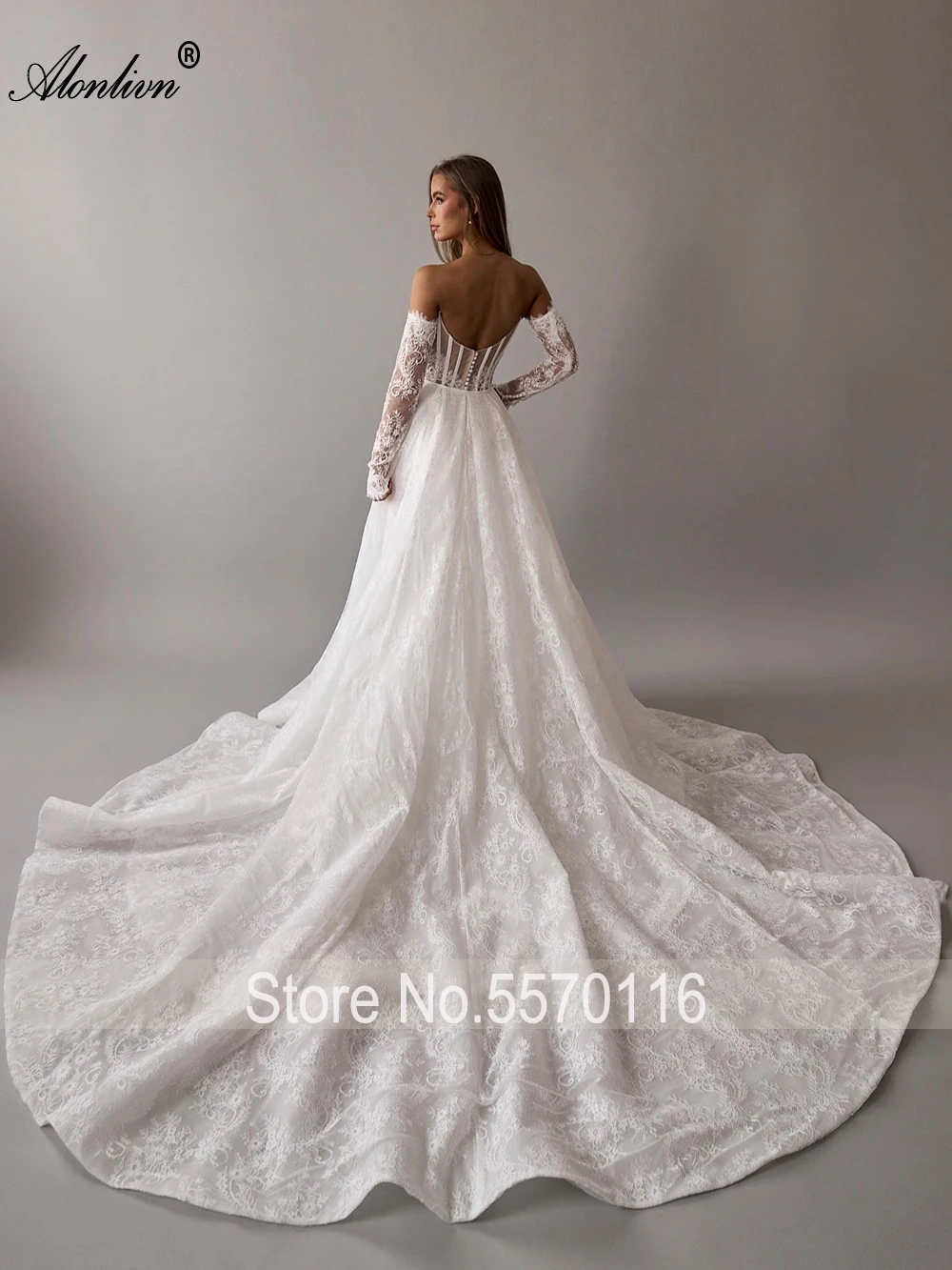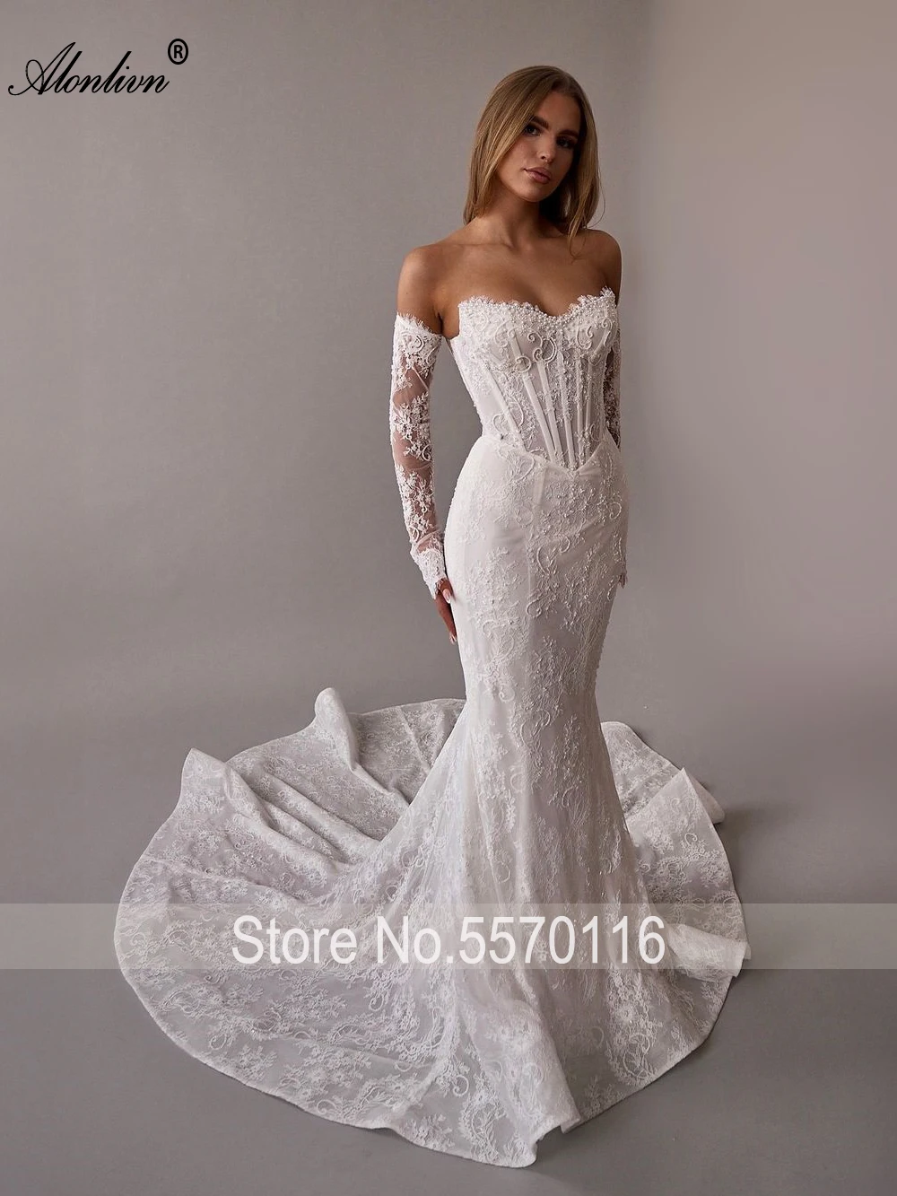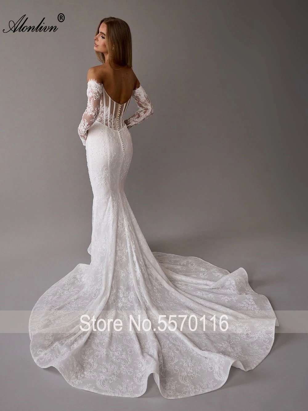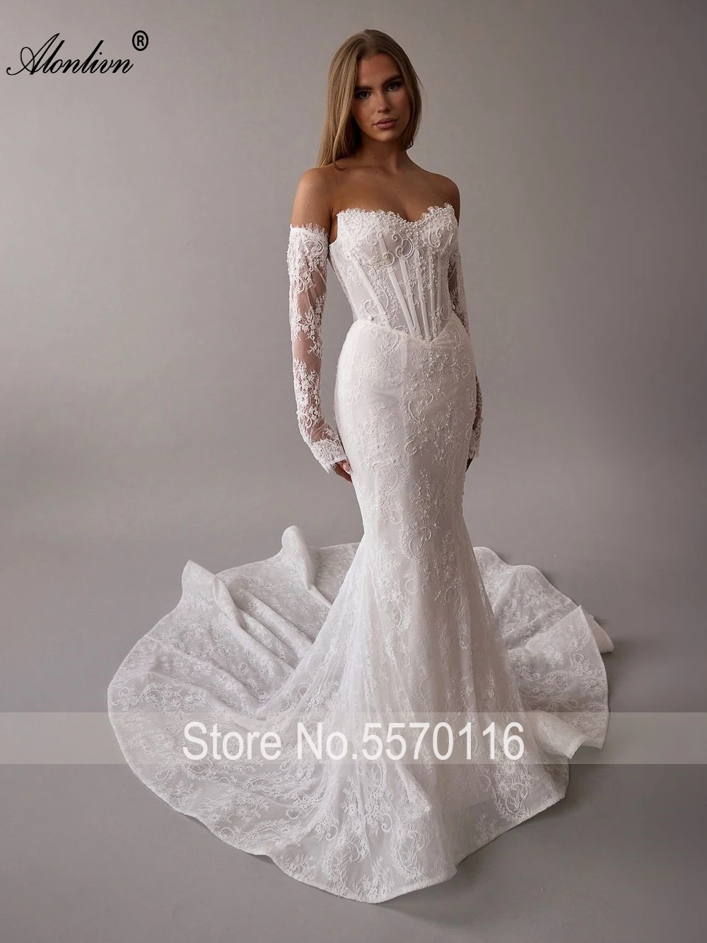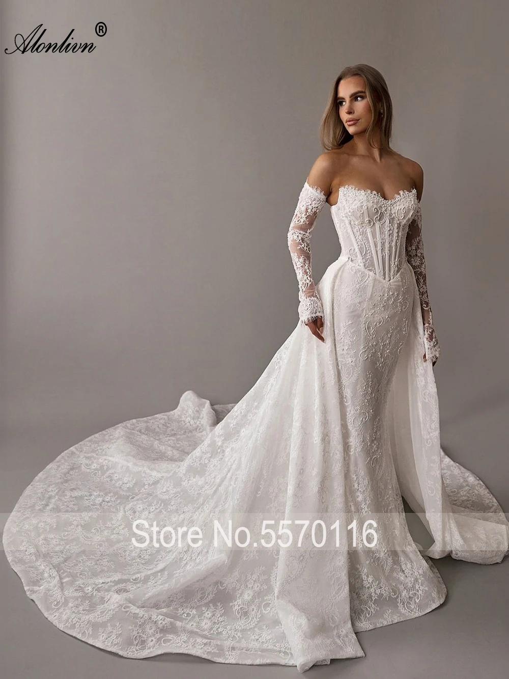 Alonlivn Customize Made Beauty Lace Fitted Beaded 2 In 1 Mermaid Wedding Gowns Trumpet Removable Train Bridal Gowns