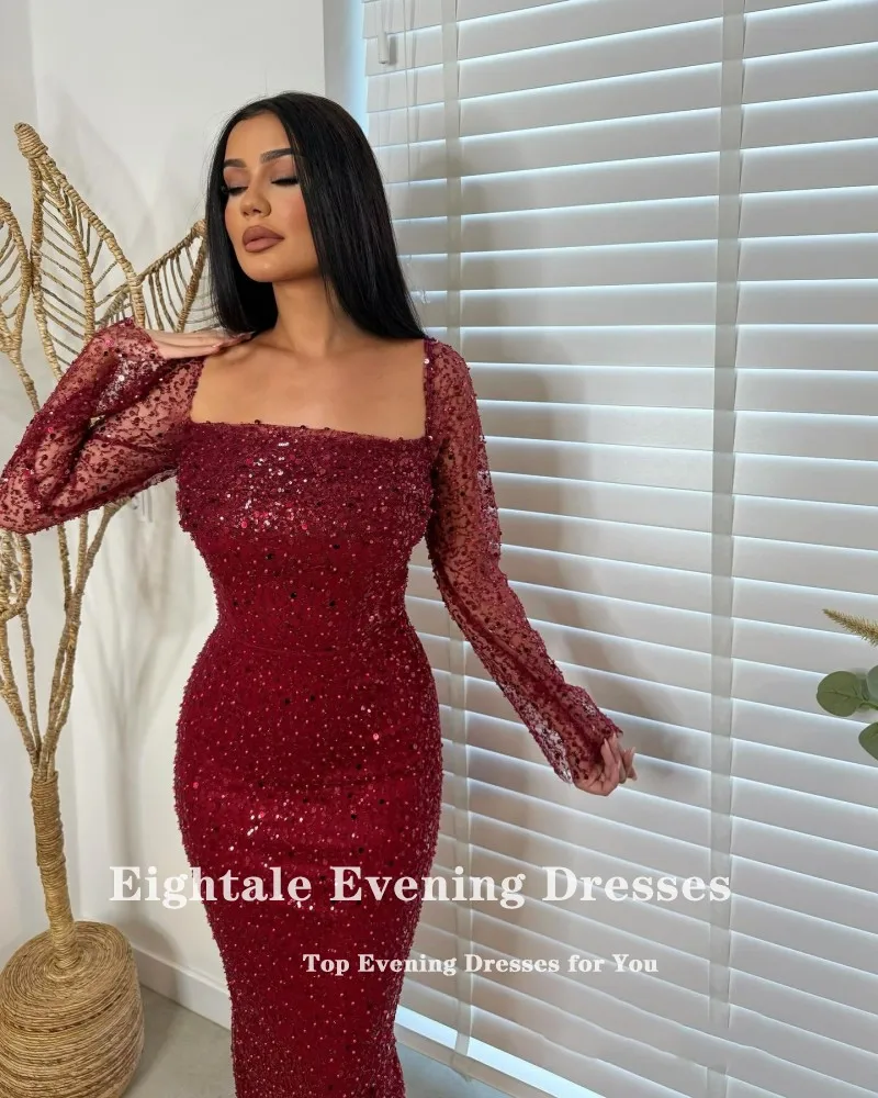 Eightale Luxury Evening Dresses with Detachable Skirt Burgundy Sequined Customized Long Sleeves Mermaid Prom Gown Wedding Party