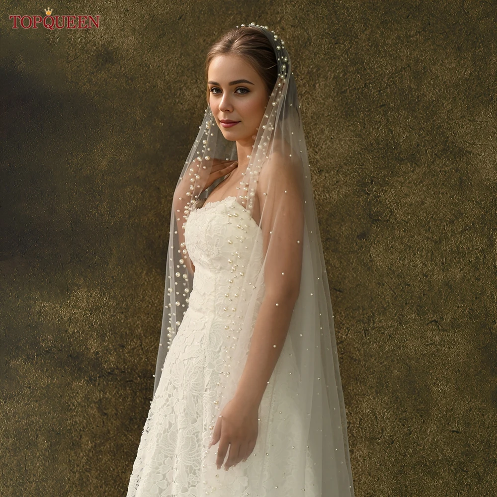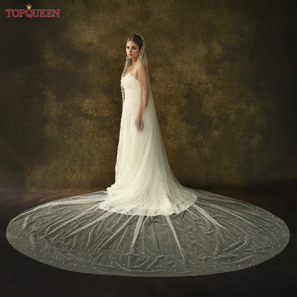 TOPQUEEN V66 Luxury Cathedral Pearl Wedding Veil No Comb Single Layer White Creamy 3m Bridal Veil Customizable