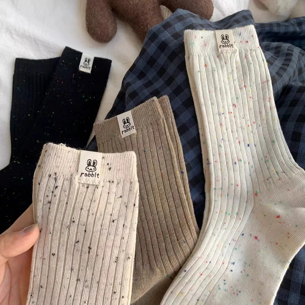 4 Pairs Women Cartoon Printed Mid Tube Sock Fashionable Colored Dot Yarn Sweat Absorbing Breathable Soft Comfortable Casual Sock