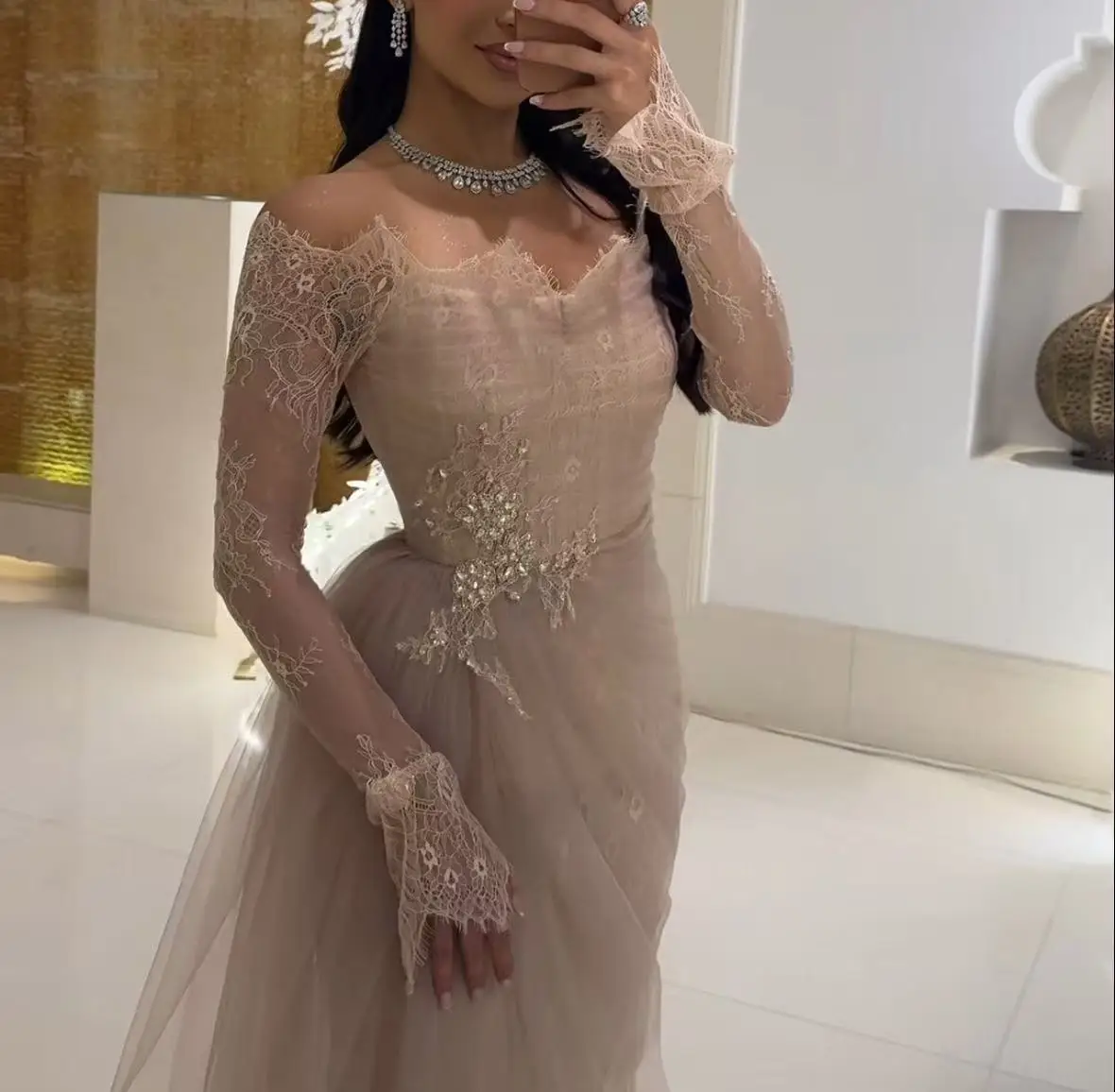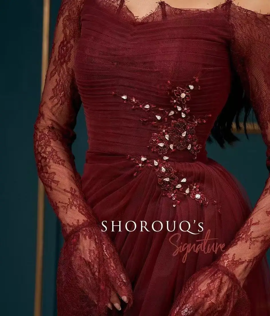 Customized Saudi Off Shoulder Long Sleeve Ball Gown Lace Crystal Formal Evening Dress Floor Length Party Dress Multi Occasion