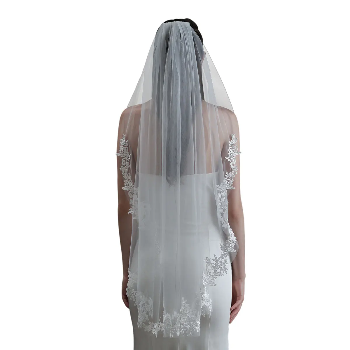 1 Tier Soft Tulle Lace Applique Bridal Veils Wedding Accessories with Comb Fingertip Length Wedding Veils