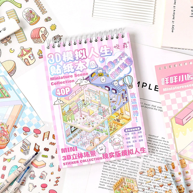 1Style 40Pcs/book Cartoon cute 3D three-dimensional scene sticker book Students' stickers handbook stickers to develop hands-on