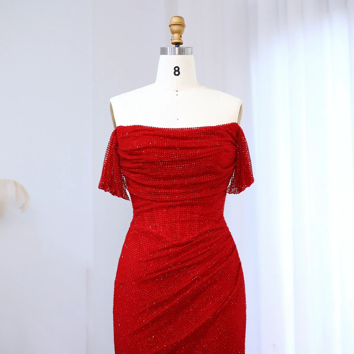 Mila Red Off the Shoulder Column Party Dresses Glitter Side High Split Evening Dresses Empire Waist Customized Prom Dresses