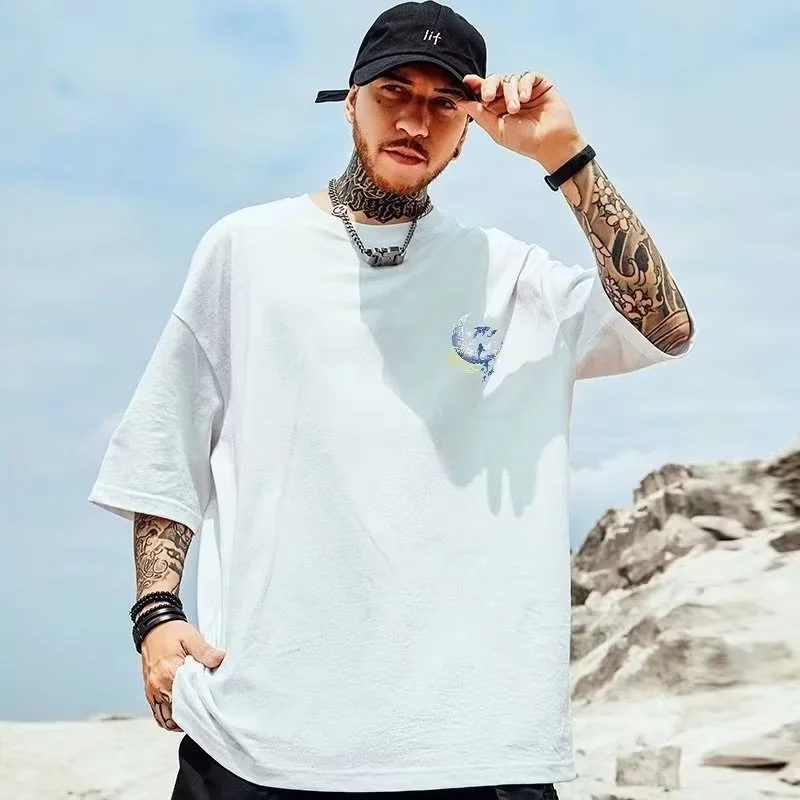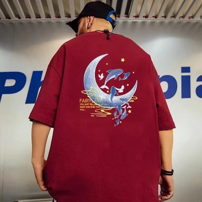 M-8XL Men Loose American Retro Style Whale Print Short Sleeved Round Neck Versatile Trendy Couple Outfit