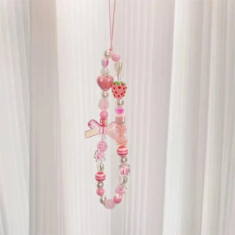Sweet and Cute Pink Strawberry Mobile Strap Phone Chains For Women Pearl Chain Phone Pendant Charm Key Anti-Lost Lanyard Jewelry