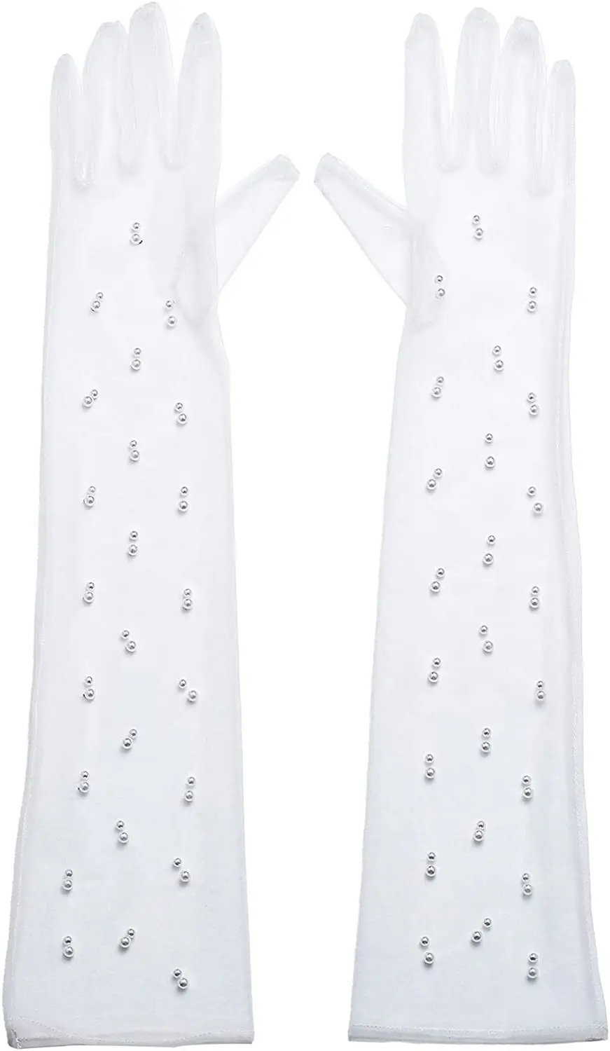 Elegant Pearl Beaded Long Elbow Bridal Gloves for Wedding Party Finger Tulle Gloves Marriage Accessories