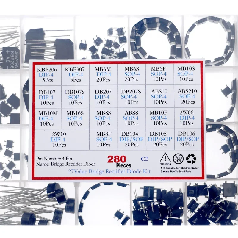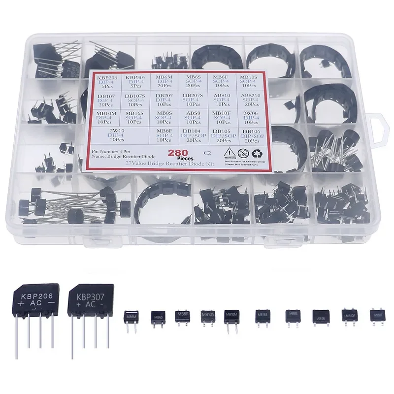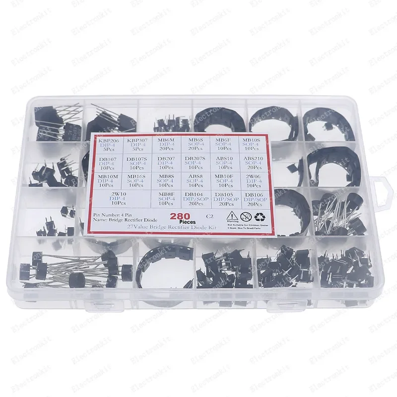 280Pcs 27Values Bridge Rectifier Assorted Kit KBP206 KBP307 MB6M MB10F MB6S DB107 DB207 ABS10 MB10M 2W10 MB8F DB104 MB16S DB106